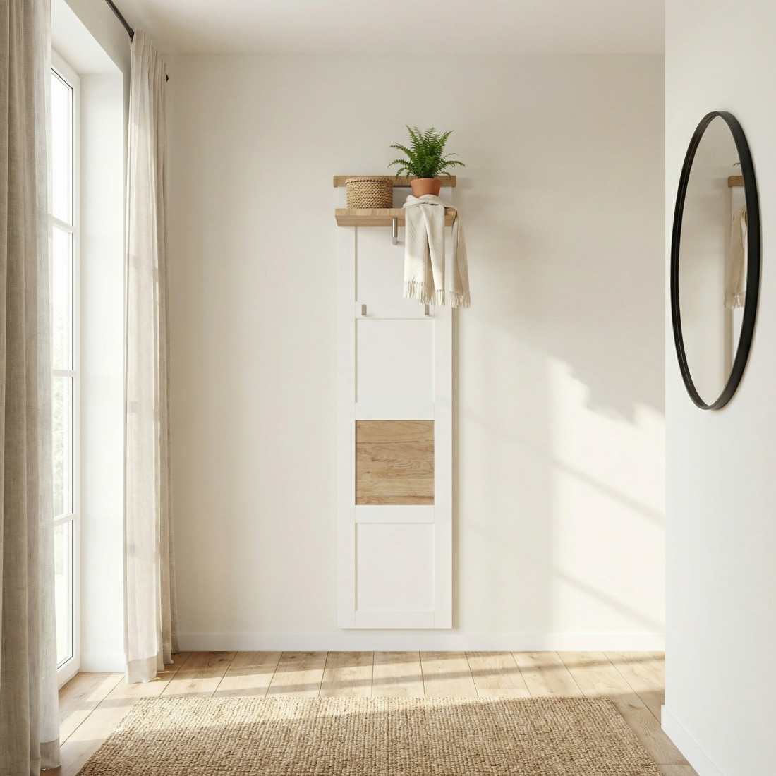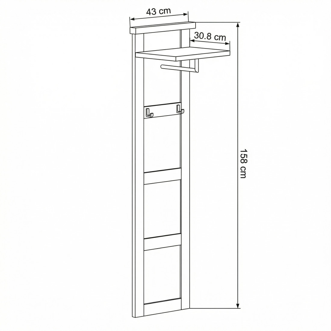 Maximizează funcționalitatea holului tău, chiar și în cele mai restrânse spații, cu Cuierul Îngust Alpina. Cu o lățime de doar 43 cm, acest panou elegant este proiectat să ofere o organizare completă fără a aglomera intrarea.
