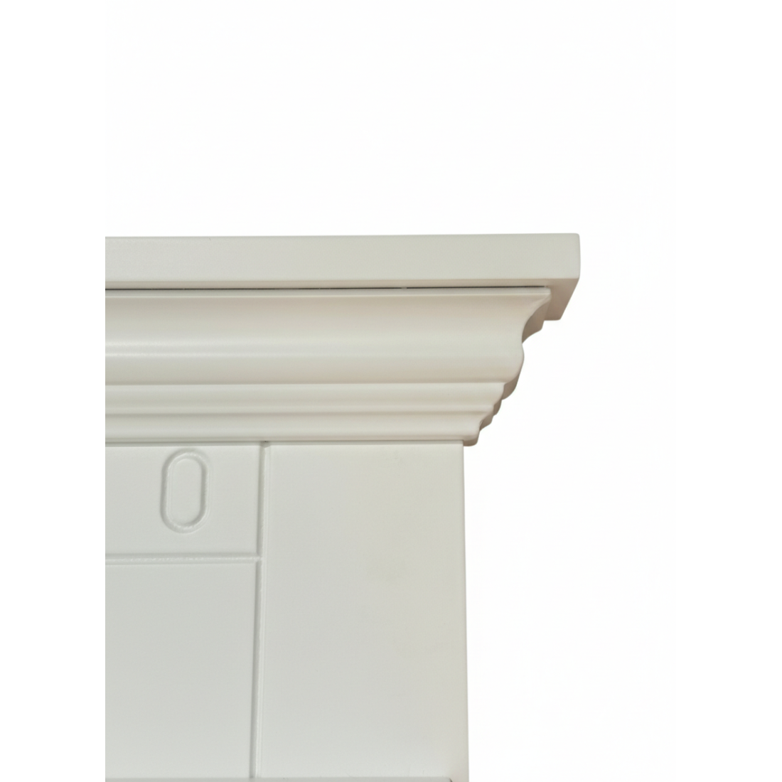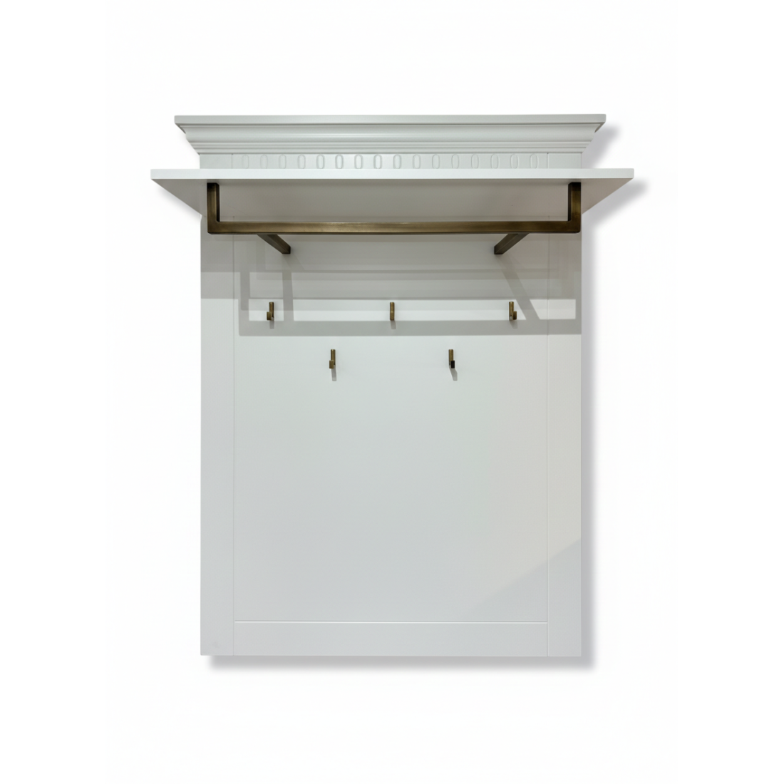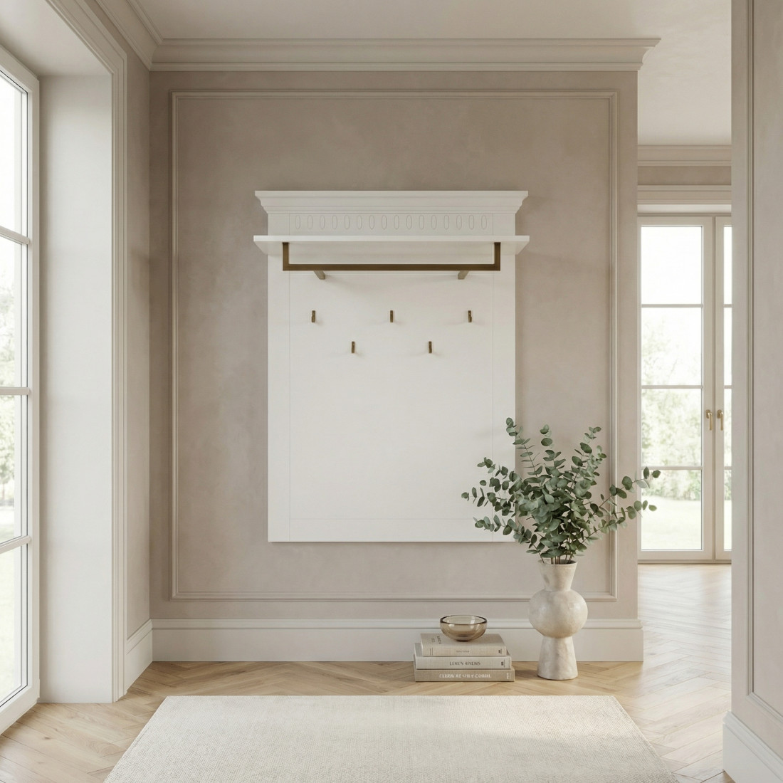 Cuierul impresionează prin cornișa superioară profilată (stil crown molding) și panoul decorativ discret, oferind un aer nobil locuinței tale. Finisajul alb mat este pus în valoare de feroneria cu aspect de bronz antichizat, creând un contrast cald și sofisticat.