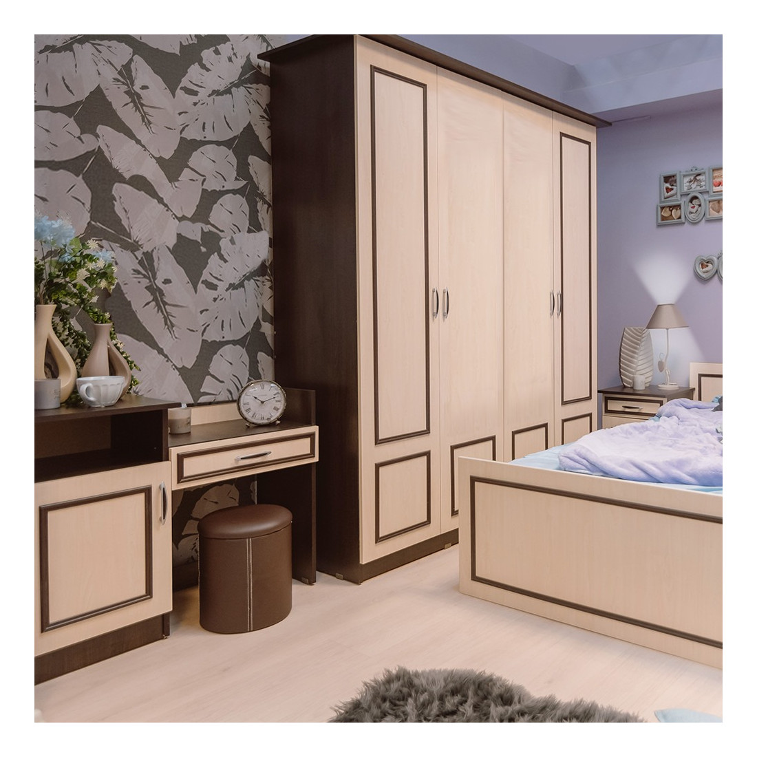Dormitorul contine: Dulap, Pat cu dimensiunea saltea: 160 x 200 cm, Suportul pentru saltea este inclus., 2 x Noptiere, Comoda, Masa toaleta.