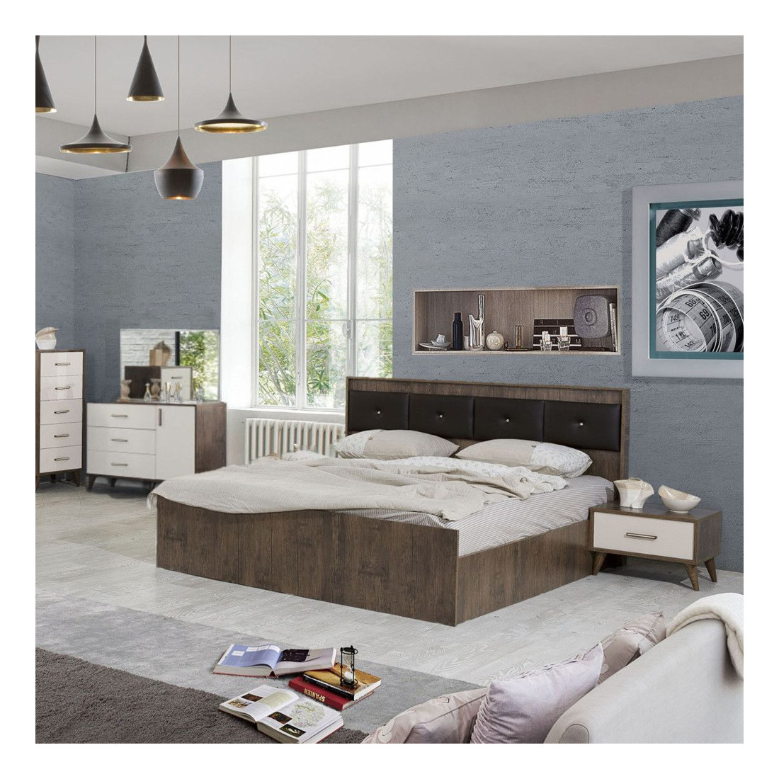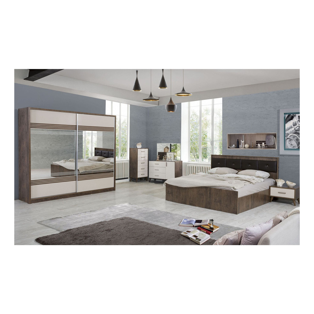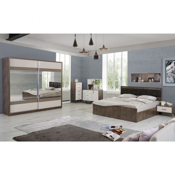Caracteristici speciale: Dormitorul contine: dulap, pat, 2 x noptiere, comoda 3 sertare cu oglinda, comoda 5 sertare, puf.
