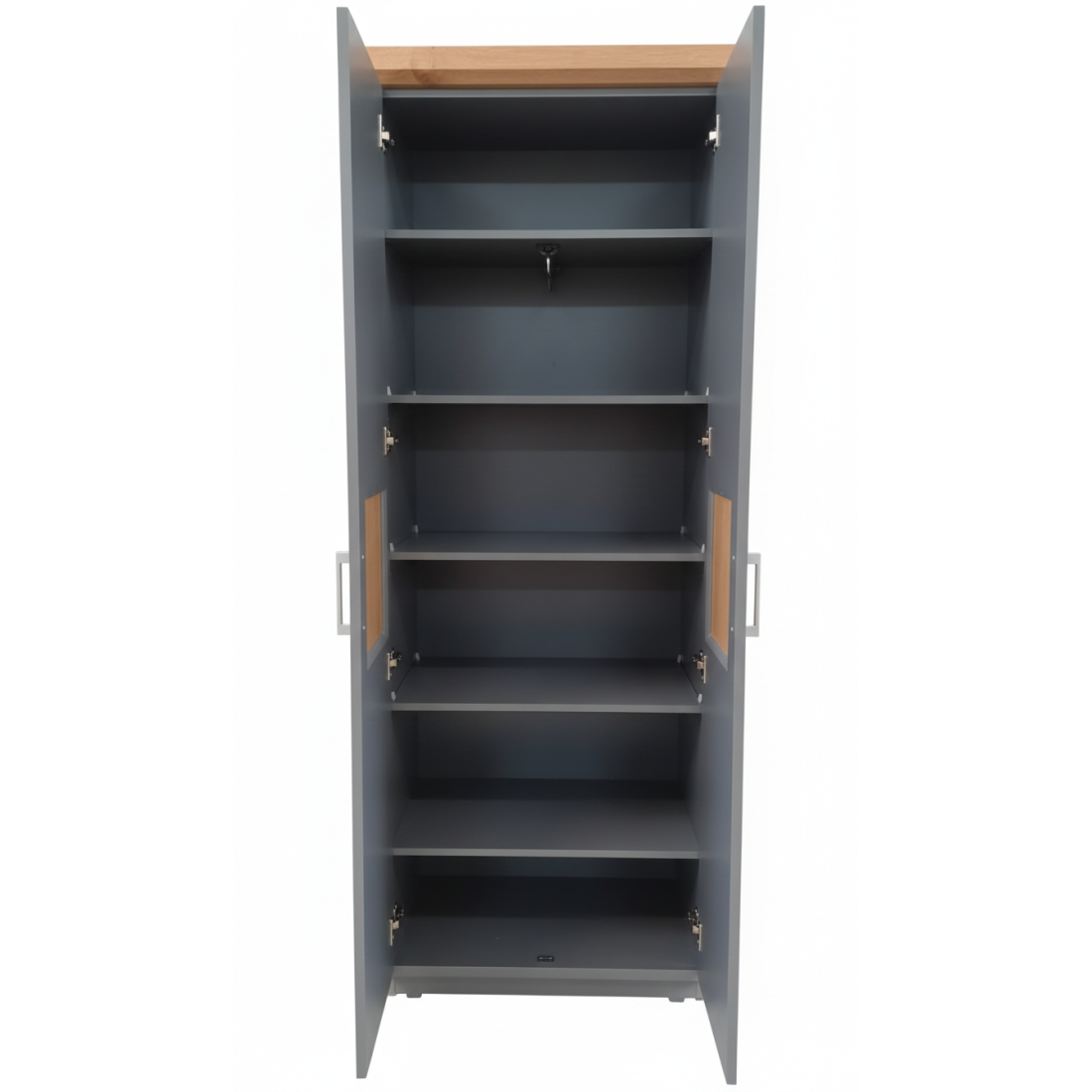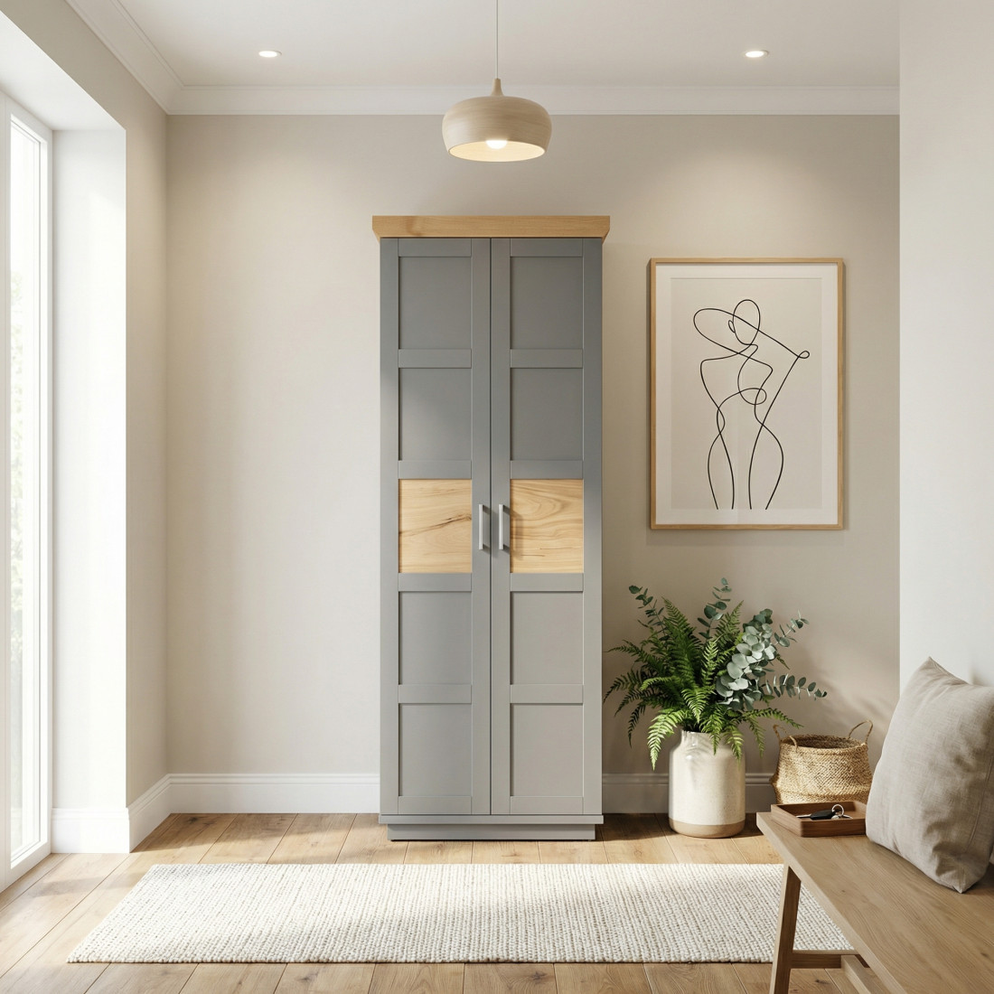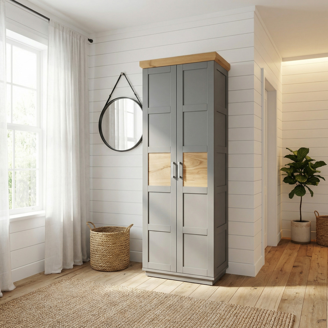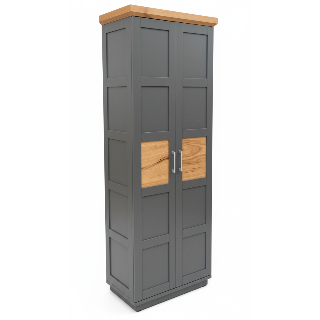 Adaugă un plus de personalitate încăperii tale cu Dulapul Alpina cu 2 Uși, o piesă care sparge monotonia prin accente naturale rafinate. Finisat în gri vopsit mat, dulapul se remarcă prin jocul de texturi: căldura lemnului este prezentă nu doar la nivelul cornișei superioare, ci și sub forma unor inserții centrale din furnir natural pe fiecare ușă.