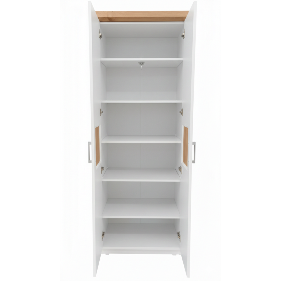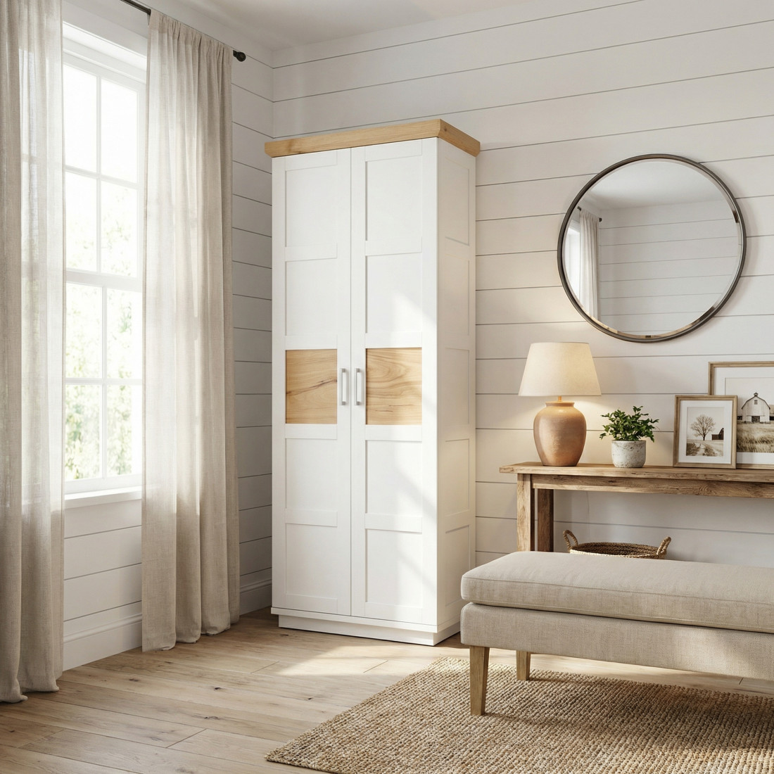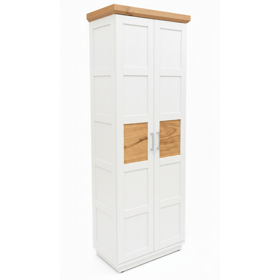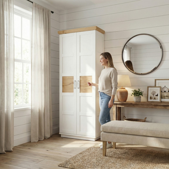 Adaugă un plus de personalitate încăperii tale cu Dulapul Alpina cu 2 Uși, o piesă care sparge monotonia prin accente naturale rafinate. Finisat în alb vopsit mat, dulapul se remarcă prin jocul de texturi: căldura lemnului este prezentă nu doar la nivelul cornișei superioare, ci și sub forma unor inserții centrale din furnir natural pe fiecare ușă.