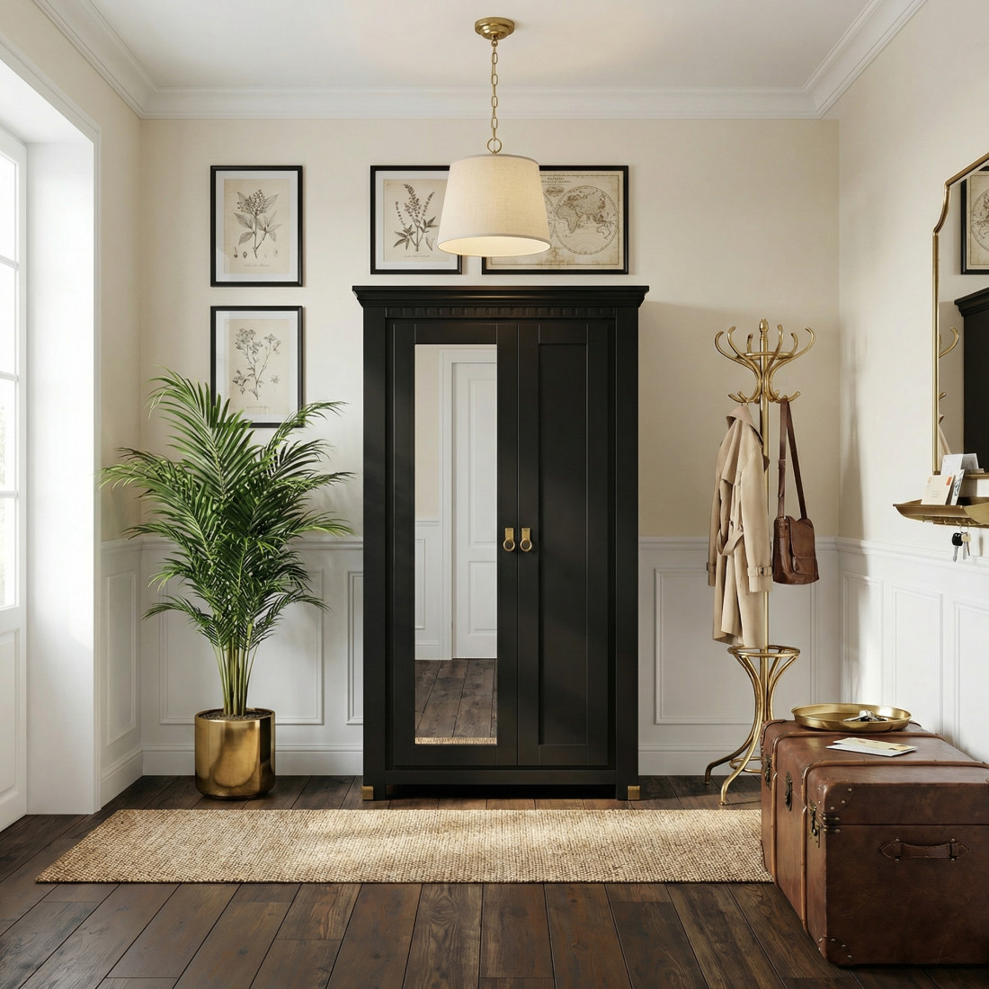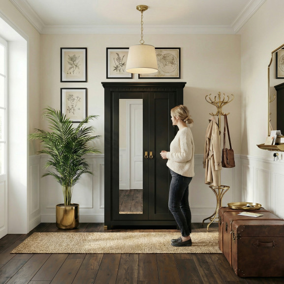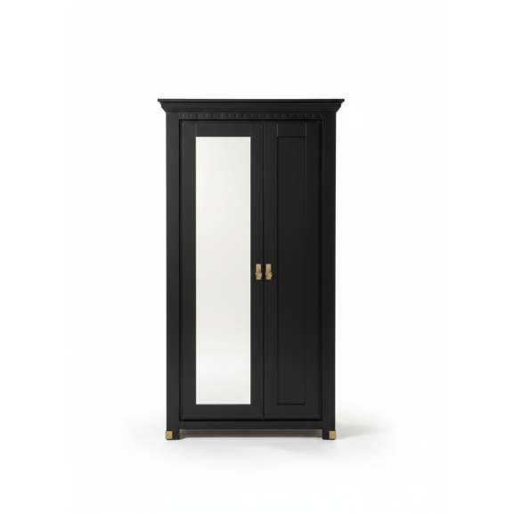 Realizat din materiale de înaltă calitate și vopsit într-o nuanță profundă de negru mat, dulapul aduce un aer sofisticat și contemporan în orice spațiu. Oglinda elegant integrată pe una dintre uși oferă un plus de luminozitate și practicitate, fiind ideală pentru pregătirea zilnică.