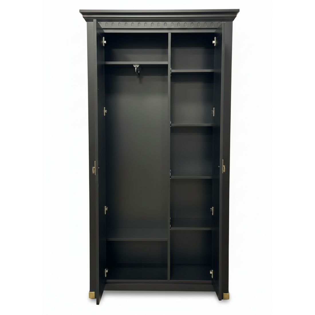 Interiorul este complet compartimentat, cu rafturi spațioase și bară pentru umerașe, oferind un spațiu generos pentru depozitarea hainelor, paltoanelor și accesoriilor.