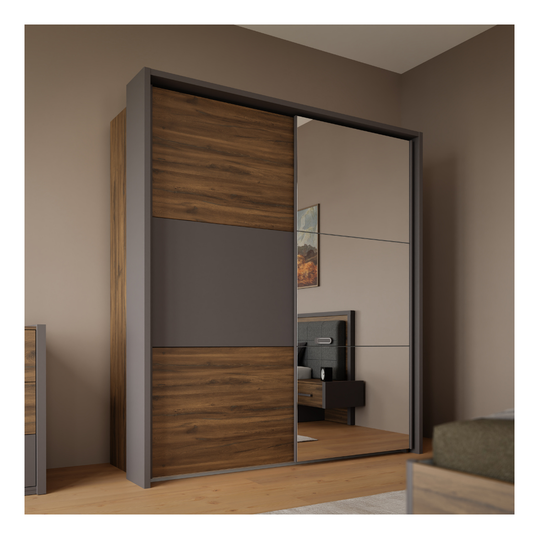 Dulap Cu Oglinda Si Rama Delicate, 2 Usi Glisante, 5 Polite, Stejar Justus si Gri Wolfram Uni, 175.5 Cm