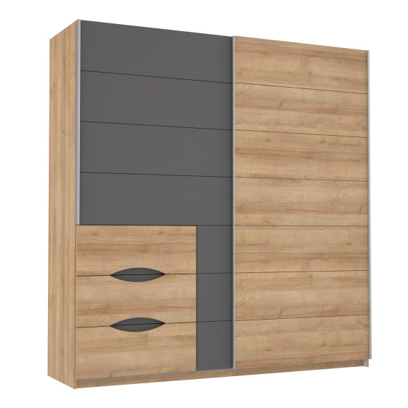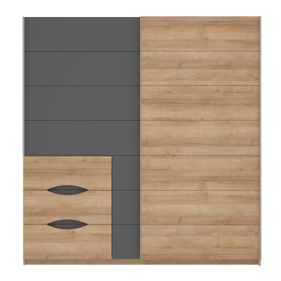 Dulapul se remarcă prin jocul de asimetrie dintre finisajul cald Riviera Oak și panourile elegante Uni Wolfram Grey. Designul este gândit pentru a oferi acces rapid la diferite tipuri de articole: o zonă cu uși culisante pentru haine voluminoase și un modul exterior cu sertare pentru accesorii. Decupajele curbate, semnătura colecției Unbound, oferă o notă artistică și o manevrabilitate excelentă.