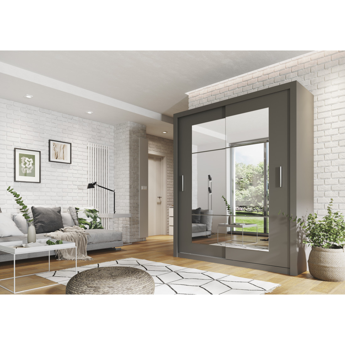 Manerele cu aspect din aluminiu completează perfect designul elegant al dulapului, adăugând un detaliu subtil și funcțional. Cele doua uși glisante facilitează accesul la conținutul interiorului, oferind un spațiu generos pentru depozitarea hainelor și a altor articole personale.