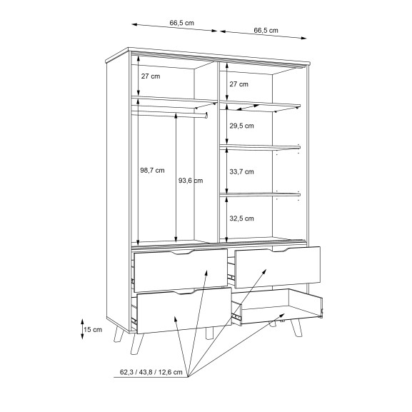 Transformă-ți dormitorul într-un spațiu ordonat și stilat cu ajutorul dulapului de dormitor Vankka, o soluție de depozitare versatilă și funcțională. Cu 2 uși spațioase și 4 sertare încorporate, acest dulap îți oferă suficient spațiu pentru a organiza hainele, accesoriile și alte obiecte personale.