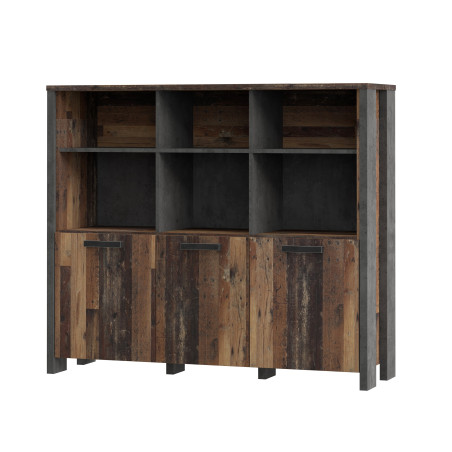 Etajera Bar Clif îmbină perfect lemnul vintage cu betonul optic gri închis pentru a crea un contrast vizual captivant. Această combinație neconvențională adaugă un farmec industrial și retro în orice spațiu.