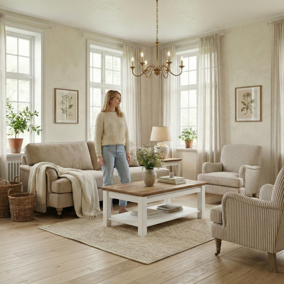 Designul mizează pe contrastul rafinat dintre picioarele masive, finisate în alb, și blatul superior din furnir natural de stejar. Această combinație aduce căldură spațiului, păstrând în același timp o notă modernă și sobră. Pe lângă aspect, masa este extrem de practică: dispune de o poliță inferioară generoasă, ideală pentru a păstra revistele, telecomenzile sau cărțile preferate la îndemână, lăsând blatul liber pentru cafea și decorațiuni.