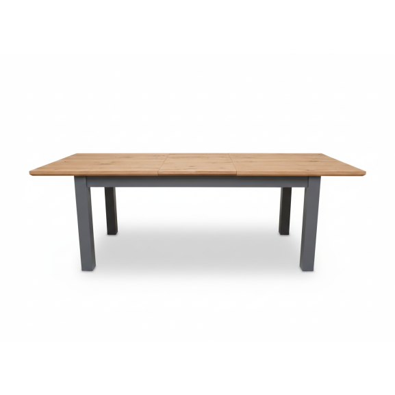 Contrastul elegant dintre picioarele solide, vopsite în gri mat, și blatul generos din furnir natural de stejar aduce un echilibru perfect între stilul rustic și cel modern. Funcționalitatea este cheia: în forma standard de 180 cm, masa găzduiește confortabil 6-8 persoane. Când ai oaspeți, mecanismul de extensie îți permite să o alungești până la 235 cm, oferind loc suficient pentru 8-10 persoane, fără a sacrifica stabilitatea sau estetica.