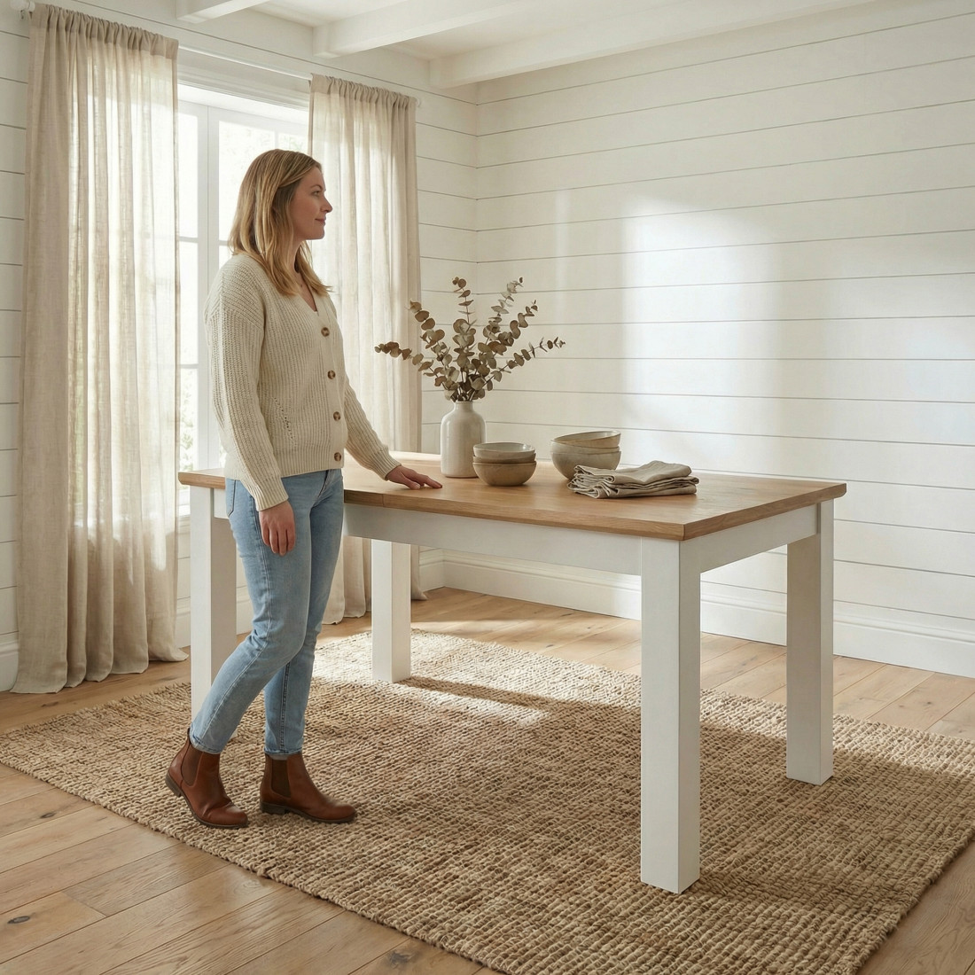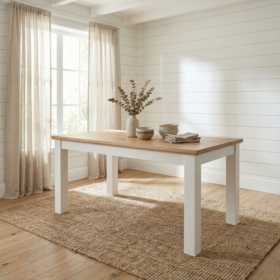 Contrastul elegant dintre picioarele solide, vopsite în alb mat, și blatul generos din furnir natural de stejar aduce un echilibru perfect între stilul rustic și cel modern. Funcționalitatea este cheia: în forma standard de 160 cm, masa găzduiește confortabil 6 persoane. Când ai oaspeți, mecanismul de extensie îți permite să o alungești până la 215 cm, oferind loc suficient pentru 8 persoane, fără a sacrifica stabilitatea sau estetica.