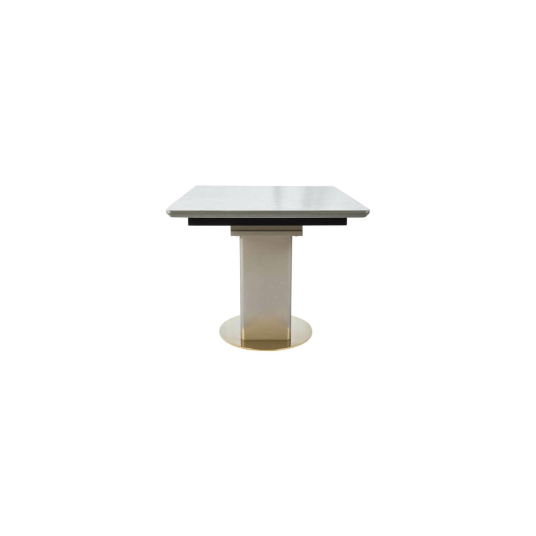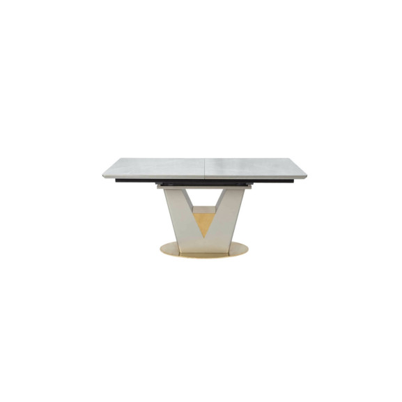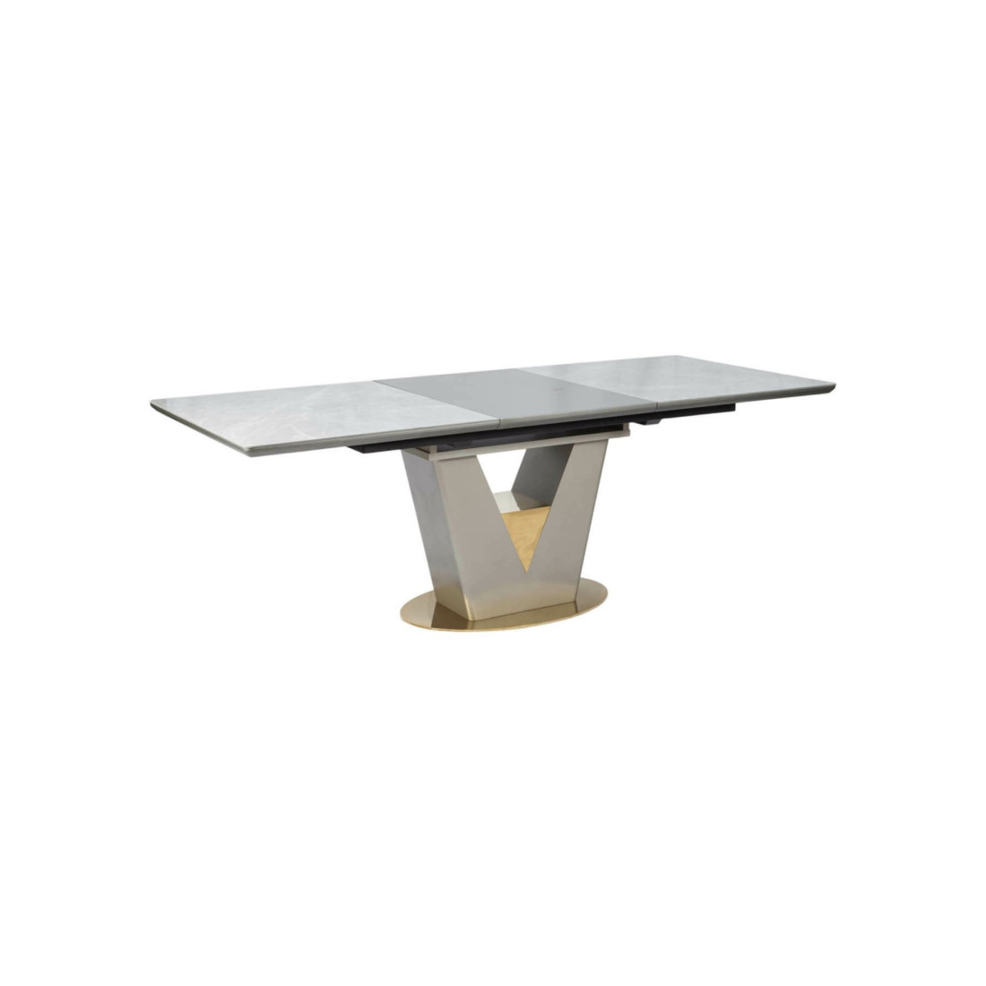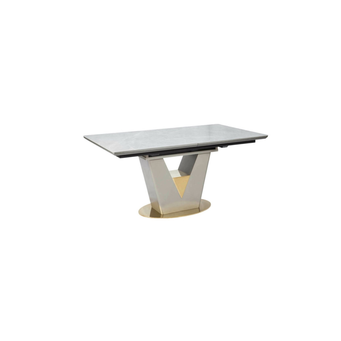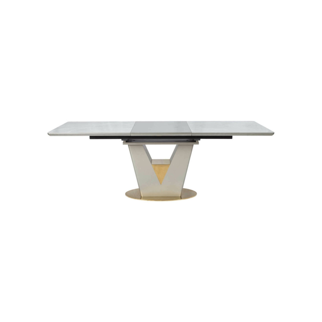 Bază Sculpturală în Formă de „V”: Masa este susținută de un picior central masiv cu un design geometric modern, în nuanțe de bej și gri, îmbogățit cu o inserție triunghiulară aurie ce adaugă o notă de opulență.