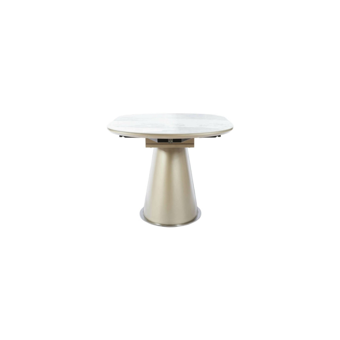 Bază Statuară: Masa este susținută de un picior central masiv, de formă conică trunchiată, în nuanțe de bej cald, accentuat de o inserție elegantă de culoare neagră care adaugă profunzime designului.