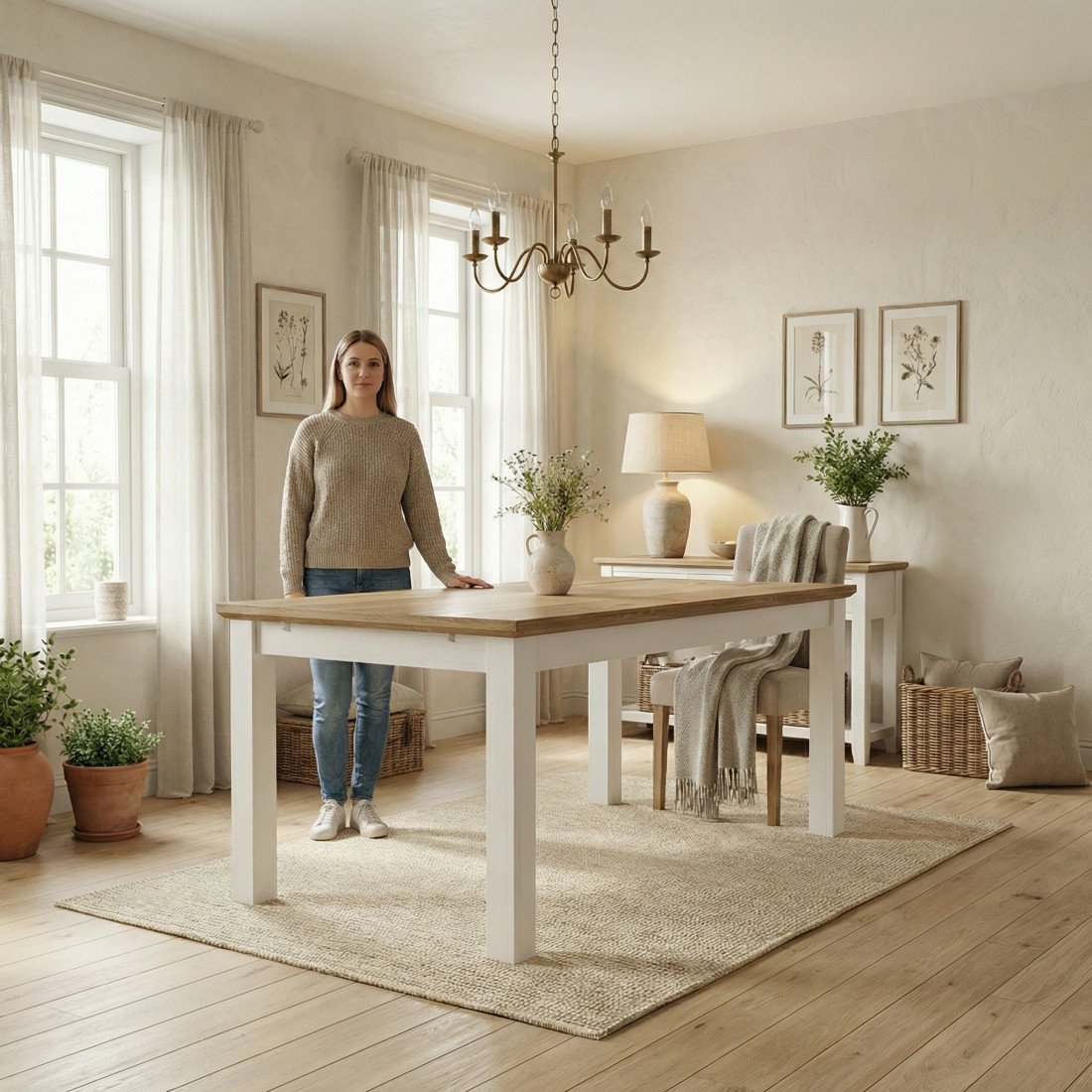 În configurația standard de 180 cm, masa găzduiește confortabil 6-8 persoane. Când ai oaspeți, mecanismul ingenios de extensie permite alungirea blatului până la 235 cm, oferind loc suficient pentru 10-12 persoane. Estetica bicoloră rămâne fidelă colecției: picioarele solide vopsite în Alb susțin un blat generos placat cu furnir natural de stejar "Zenith", a cărui textură caldă invită la atingere. Extensia de tip Butterfly se ascunde discret sub blat, păstrând linia curată a designului atunci când nu este utilizată.