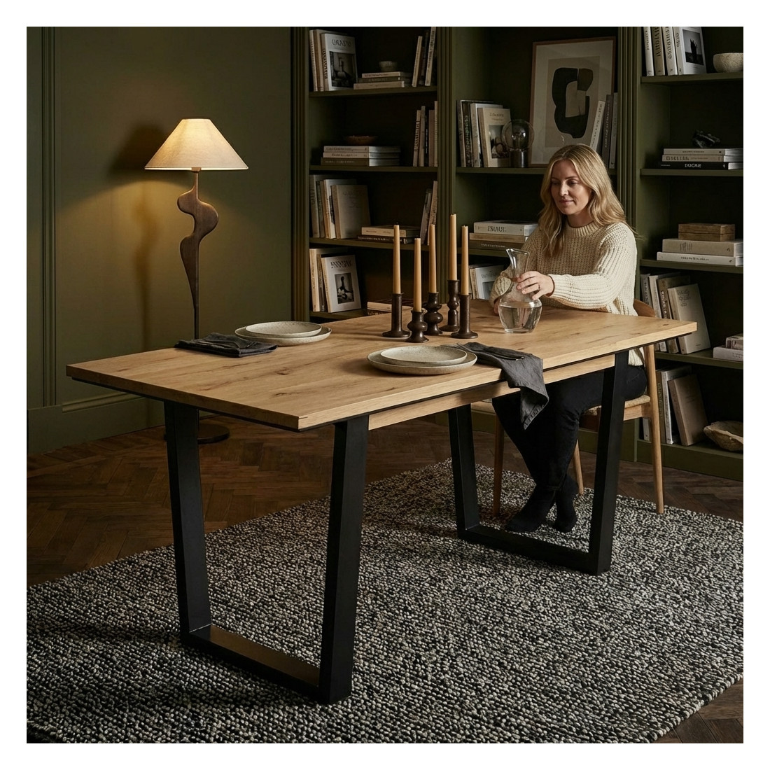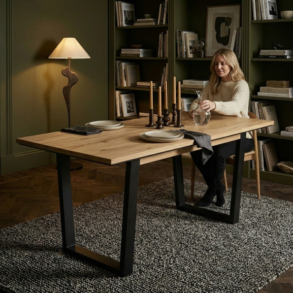 Nuanțele de Smoked Oak și Negru se combină armonios, aducând un contrast elegant și sofisticat în designul mesei, potrivindu-se într-o varietate de medii și decoruri.