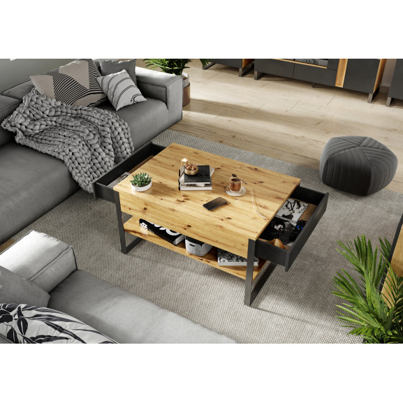 Această soluție înseamnă că va fi întotdeauna un loc pentru o ceașcă de cafea preferată pe blat. Masuta de cafea Minolta este o propunere eleganta si la moda pentru sufragerie si sufragerie moderne. Caracterul distinctiv al mobilierului se datorează picioarelor zvelte, metalice, negru profund, mat și unui decor care imită lemnul natural. Fronturile de sertare fara maner subliniaza senzatia de ordine, iar inchiderea lor comoda este asigurata de sistemul de inchidere soft.