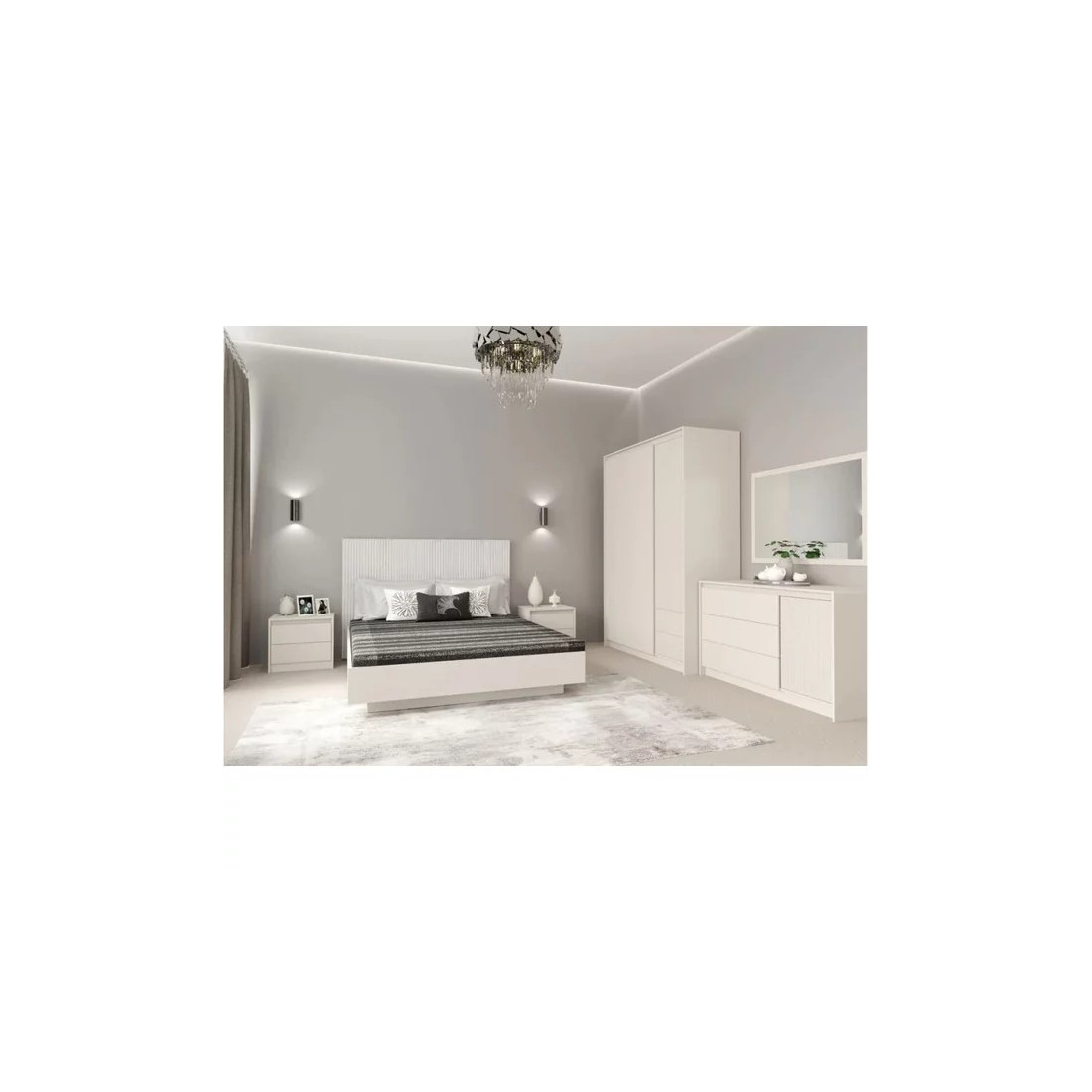 Acest detaliu superior nu este doar cromatic, ci și textural, prezentând celebrul model frezat vertical (riflaj) care se regăsește și pe tăblia patului sau pe ușile dulapului. Dincolo de design, noptiera este extrem de practică. Cele 2 sertare spațioase oferă locul perfect pentru a păstra cartea de seară, ochelarii sau încărcătorul, menținând suprafața noptierei liberă pentru o veioză elegantă și un ceas deșteptător.
