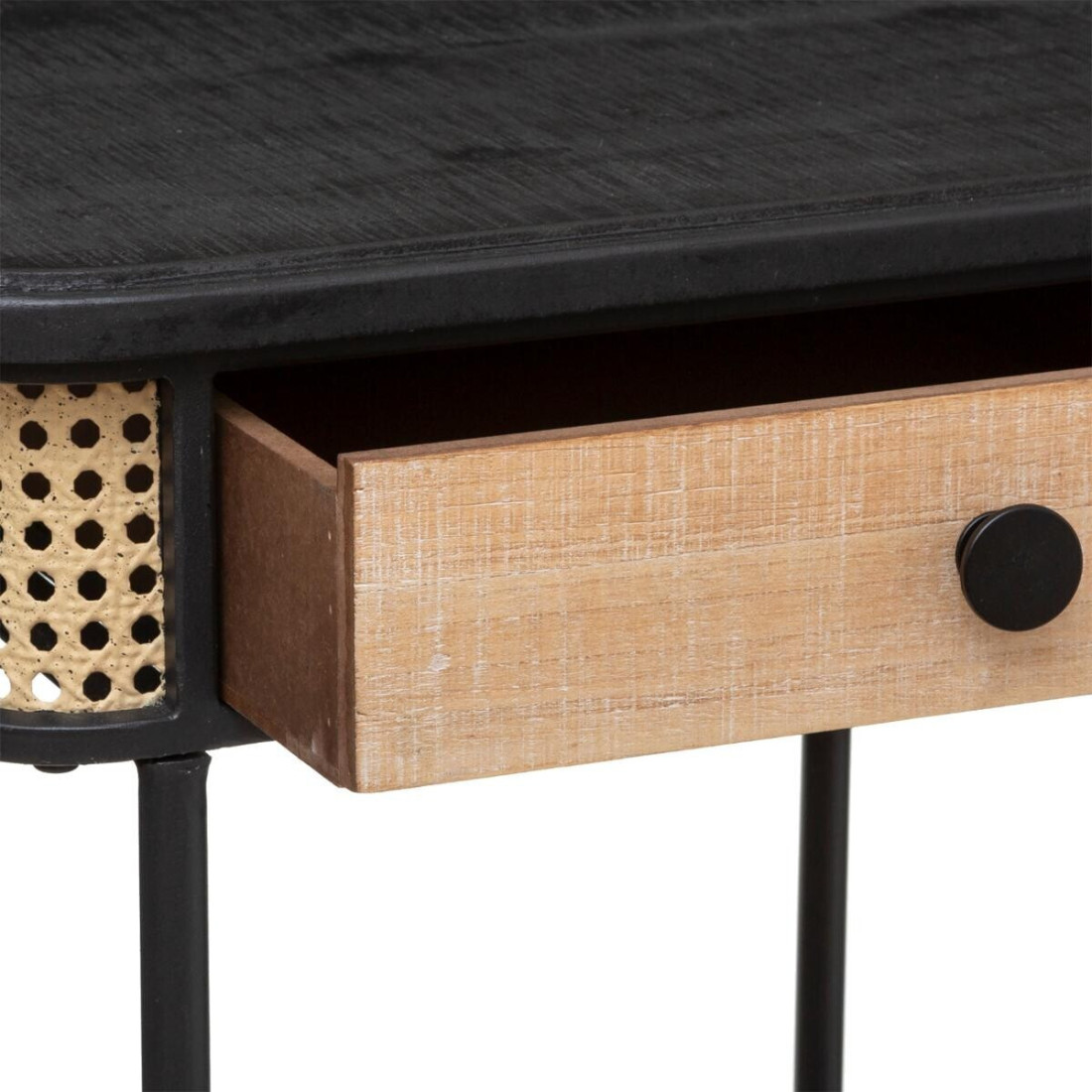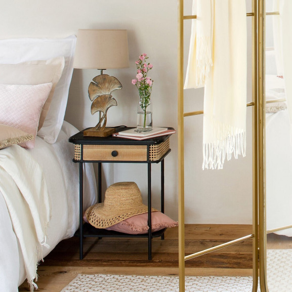 O lampa de masa din ratan sau rachita plasata pe raftul superior se va potrivi perfect spiritului acestei noptiere.