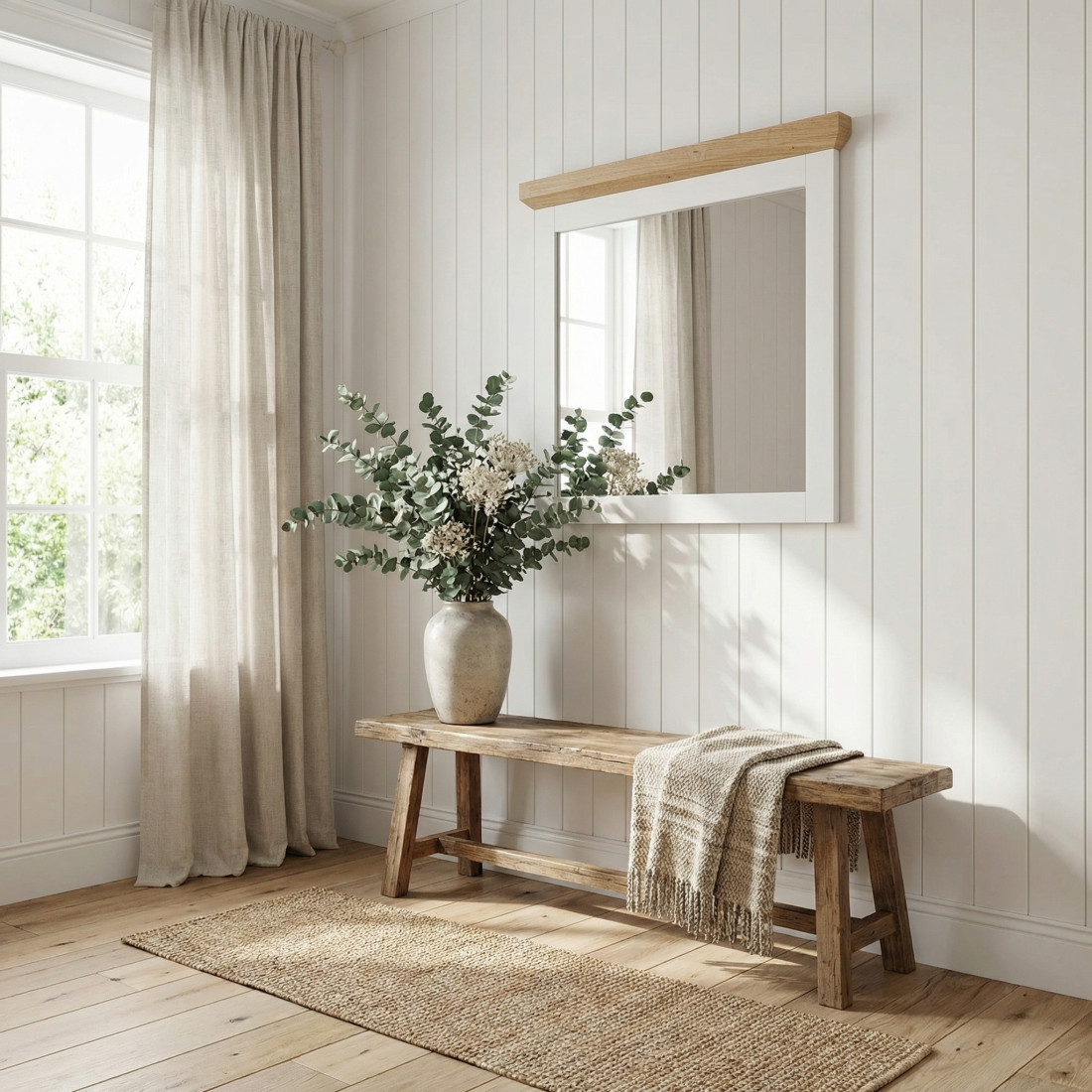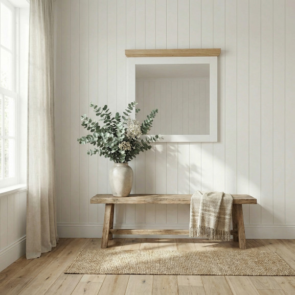 Detaliul care face diferența este cornișa superioară din furnir de stejar, o "semnătură" a colecției Alpina care adaugă o notă de căldură și noblețe, legând vizual oglinda de restul mobilierului. Este ideală pentru a fi montată deasupra comodei de pantofi, creând un ansamblu armonios și primitor la intrarea în locuință.
