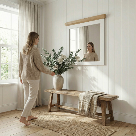 Completează decorul casei tale cu Oglinda Alpina, un accesoriu esențial care îmbină utilitatea cu designul rafinat. Rama sa solidă, finisată în alb vopsit, încadrează elegant suprafața generoasă a oglinzii, oferind luminozitate și senzația de spațiu amplu, chiar și în holurile mai mici.