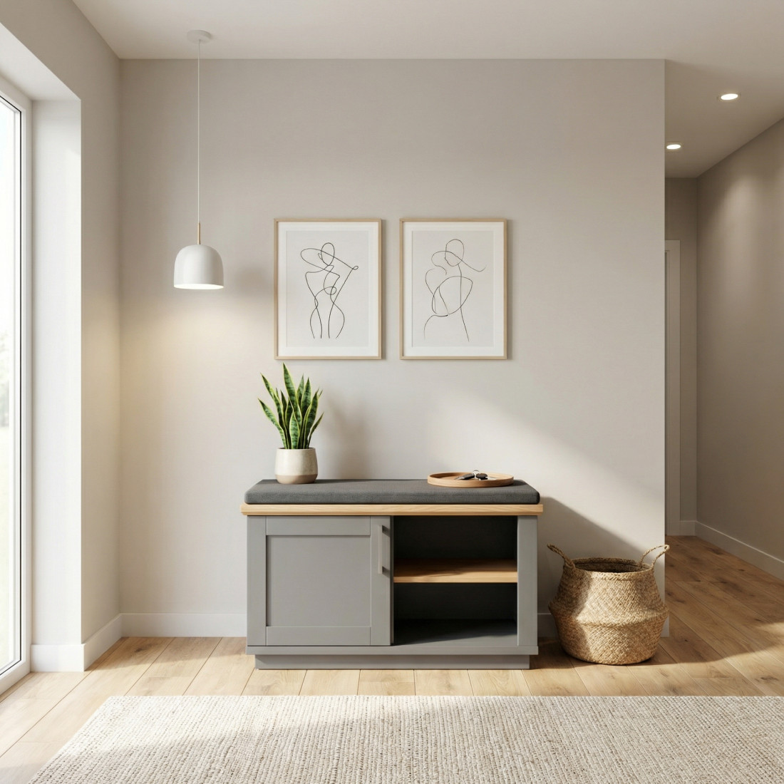 Zona centrală: Dispune de 1 sertar practic pentru chei, perii sau accesorii, și o ușă inferioară pentru încălțămintea purtată frecvent.