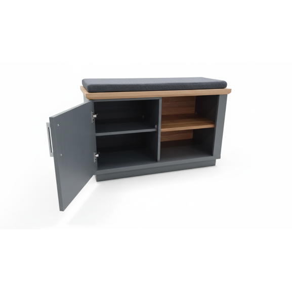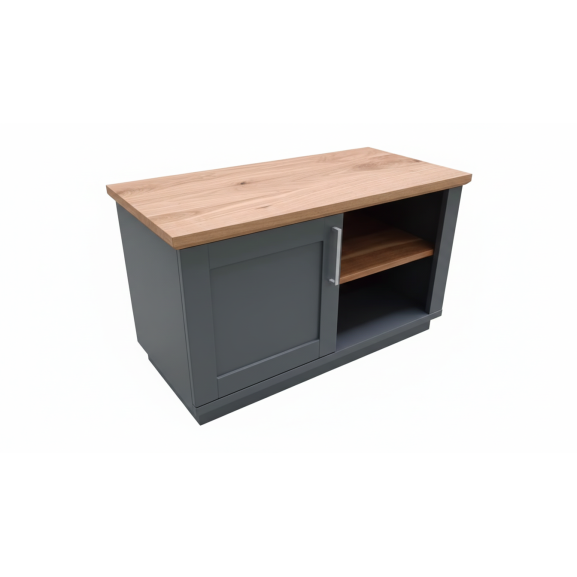 Finisajul gri vopsit oferă luminozitate, iar blatul superior din furnir natural de stejar adaugă o notă de lux și căldură. Compartimentarea este visul oricărui organizator: