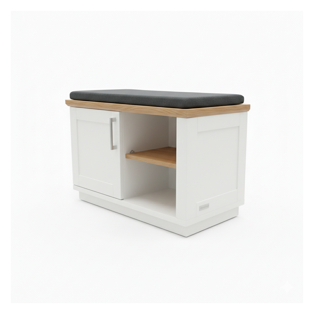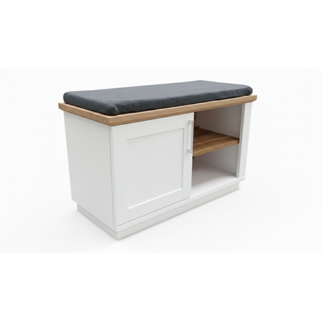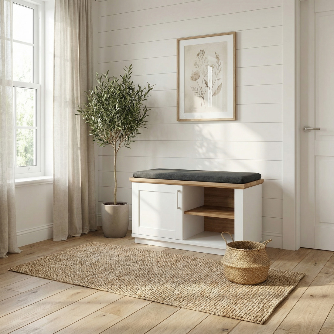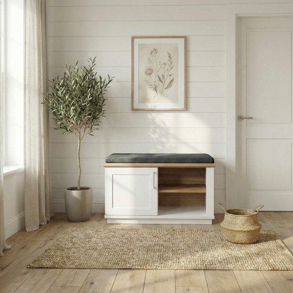 Finisajul alb vopsit oferă luminozitate, iar blatul superior din furnir natural de stejar adaugă o notă de lux și căldură. Compartimentarea este visul oricărui organizator: