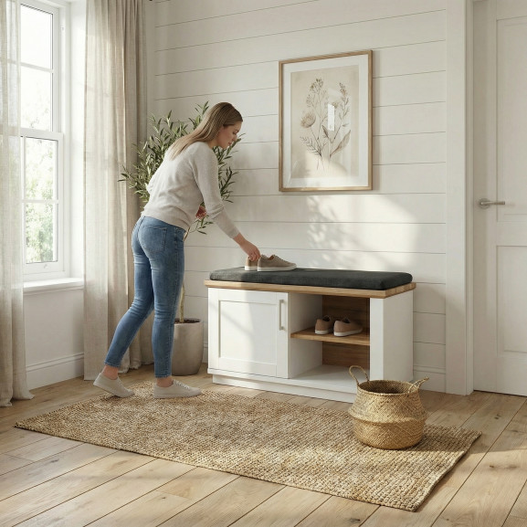 Zona centrală: Dispune de 1 sertar practic pentru chei, perii sau accesorii, și o ușă inferioară pentru încălțămintea purtată frecvent.