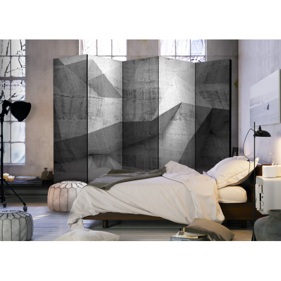 Paravanul decorativ "Concrete Geometry II [Room Dividers]" este un decor unic pentru interioarele moderne. Paravanul este compus din 5 părți, realizat din lemn și imprimat pe ambele părți. Vă va împărți spațiul în mod discret și va crea un design interior uimitor. Datorită unei realizări perfecte și a unui design original Full HD, paravanele de cameră oferă un aspect unic oricărui interior. Paravanele decorative pentru locuințe reprezintă o modalitate originală de decorare a interiorului. De remarcat este faptul că posedă aplicații practice - paravanele de cameră pot fi utilizate de ex. pentru a ascunde un uscător de rufe. Reprezintă un decor foarte original care poate fi utilizat atât în cazul spațiilor de locuit, cât și în cazul spațiilor de lucru, de ex: frizerii, cabinete medicale sau chiar și birouri de contabilitate.