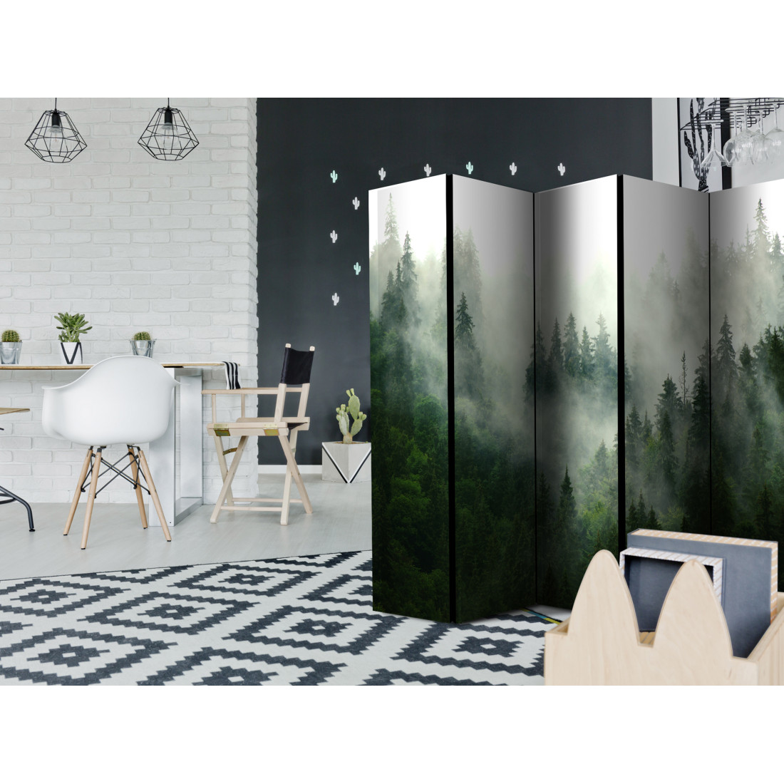 Paravanul decorativ "Coniferous Forest II [Room Dividers]" este un decor unic pentru interioarele moderne. Paravanul este compus din 5 părți, realizat din lemn și imprimat pe ambele părți. Vă va împărți spațiul în mod discret și va crea un design interior uimitor. Datorită unei realizări perfecte și a unui design original Full HD, paravanele de cameră oferă un aspect unic oricărui interior. Paravanele decorative pentru locuințe reprezintă o modalitate originală de decorare a interiorului. De remarcat este faptul că posedă aplicații practice - paravanele de cameră pot fi utilizate de ex. pentru a ascunde un uscător de rufe. Reprezintă un decor foarte original care poate fi utilizat atât în cazul spațiilor de locuit, cât și în cazul spațiilor de lucru, de ex: frizerii, cabinete medicale sau chiar și birouri de contabilitate.