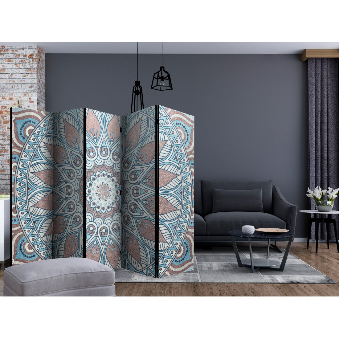 Paravanul decorativ "Oriental Circle II [Room Dividers]" este un decor unic pentru interioarele moderne. Paravanul este compus din 5 părți, realizat din lemn și imprimat pe ambele părți. Vă va împărți spațiul în mod discret și va crea un design interior uimitor. Datorită unei realizări perfecte și a unui design original Full HD, paravanele de cameră oferă un aspect unic oricărui interior. Paravanele decorative pentru locuințe reprezintă o modalitate originală de decorare a interiorului. De remarcat este faptul că posedă aplicații practice - paravanele de cameră pot fi utilizate de ex. pentru a ascunde un uscător de rufe. Reprezintă un decor foarte original care poate fi utilizat atât în cazul spațiilor de locuit, cât și în cazul spațiilor de lucru, de ex: frizerii, cabinete medicale sau chiar și birouri de contabilitate.