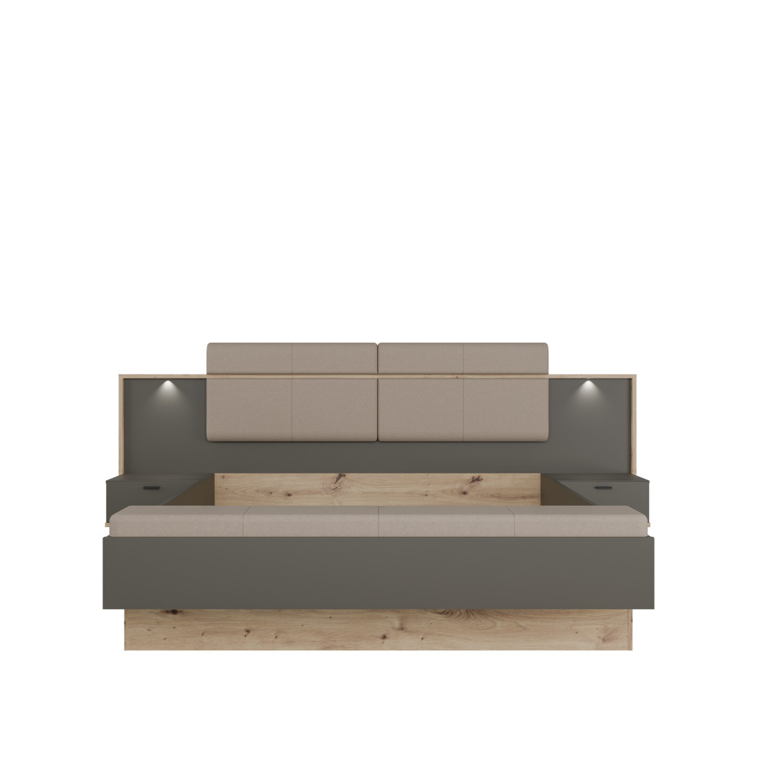Elementul central al patului este căpătâiul lat, care încadrează armonios zona de dormit și integrează cele două noptiere suspendate. Această arhitectură "plutitoare" facilitează curățenia și oferă camerei un aspect aerisit. Contrastul dintre finisajul Artisan Oak (Stejar) și panourile gri închis Umbra creează o estetică modernă, pusă în valoare de detaliile tapițate de pe căpătâi și bancheta de la picioarele patului.
