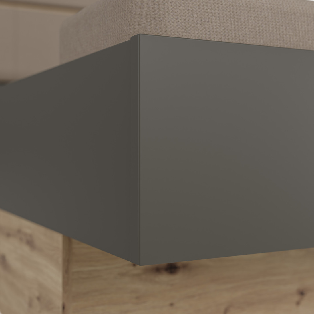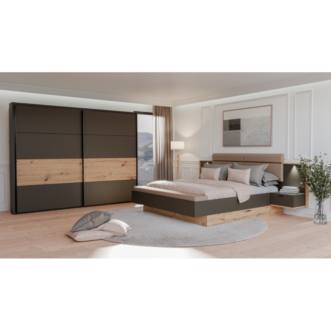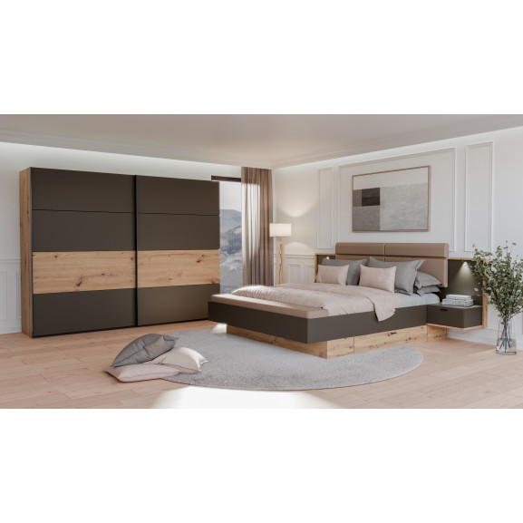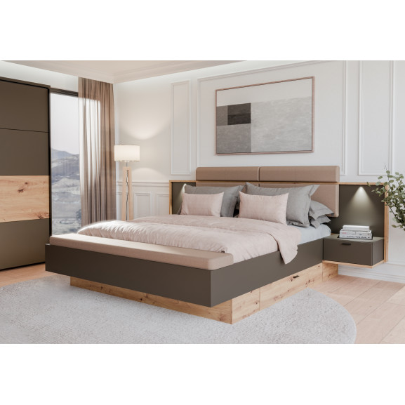 Elementul central al patului este căpătâiul lat, care încadrează armonios zona de dormit și integrează cele două noptiere suspendate. Această arhitectură "plutitoare" facilitează curățenia și oferă camerei un aspect aerisit. Contrastul dintre finisajul Artisan Oak (Stejar) și panourile gri închis Umbra creează o estetică modernă, pusă în valoare de detaliile tapițate de pe căpătâi și bancheta de la picioarele patului.