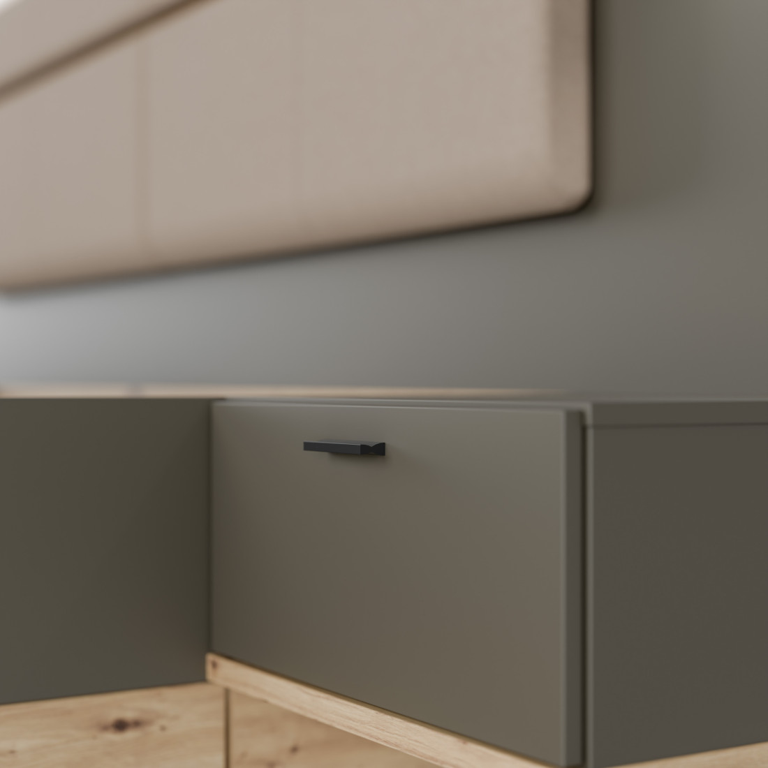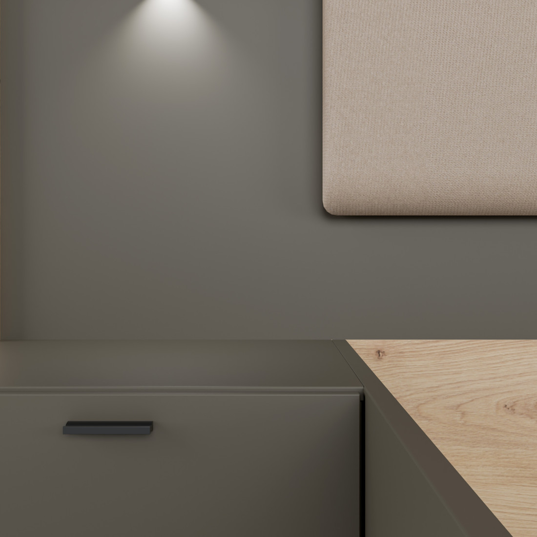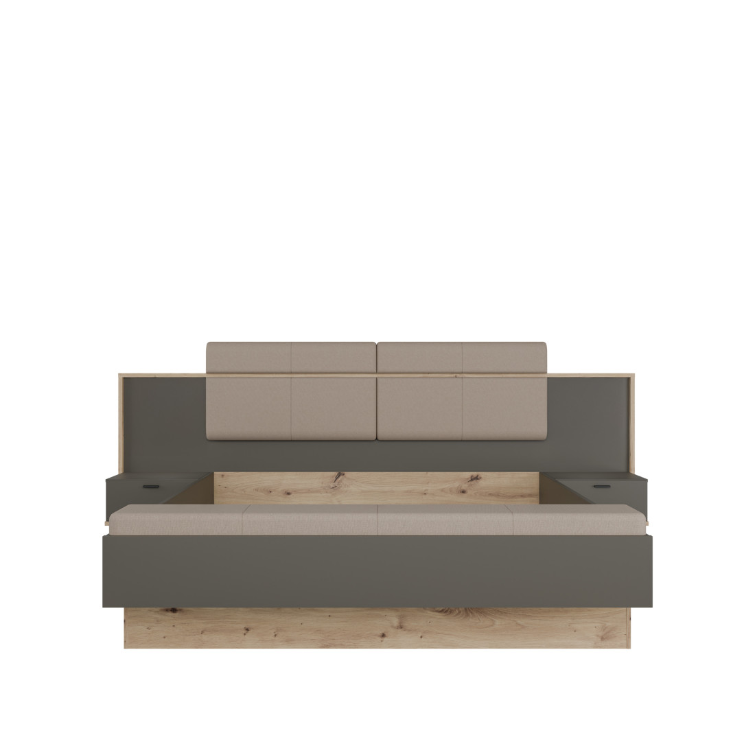 Elementul central al patului este căpătâiul lat, care încadrează armonios zona de dormit și integrează cele două noptiere suspendate. Această arhitectură "plutitoare" facilitează curățenia și oferă camerei un aspect aerisit. Contrastul dintre finisajul Artisan Oak (Stejar) și panourile gri închis Umbra creează o estetică modernă, pusă în valoare de detaliile tapițate de pe căpătâi și bancheta de la picioarele patului.