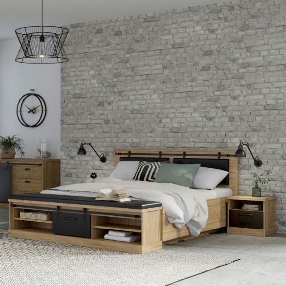 Căutați confort și eleganță pentru dormitorul dumneavoastră? Descoperiți patul Kaszimiro cu înălțime reglabilă, realizat din lemn de stejar Waterford de calitate și finisat cu un elegant ton negru. Cu un design modern și atemporal, acest pat adaugă un plus de rafinament și funcționalitate spațiului dumneavoastră.
