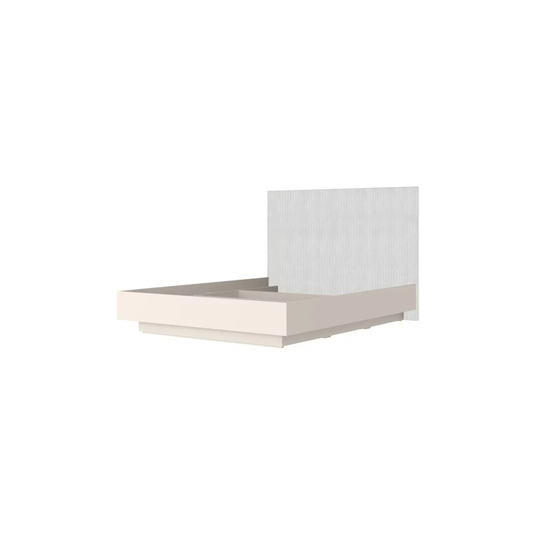 Tăblie: Tapițată, nuanță Gri Deschis, cu model decorativ vertical (striații/cusături) care se asortează cu fronturile dulapului din aceeași gamă.