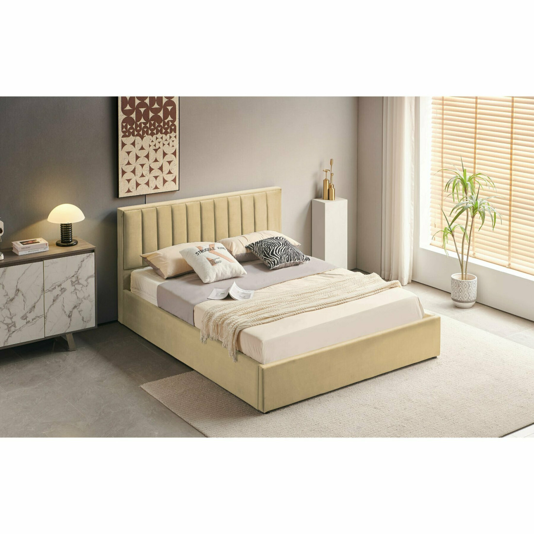 Pat Tapitat Blanca, Dimensiune Saltea 140 x 200 Cm, Somiera Rabatabila, Lada Depozitare, Bej