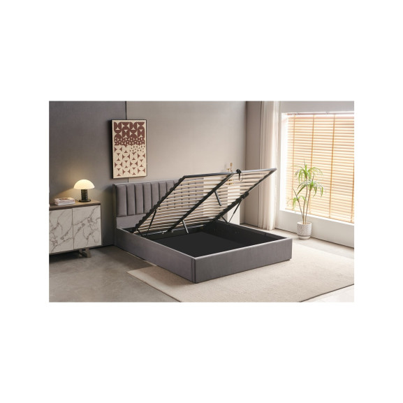 Pat Tapitat Blanca, Dimensiune Saltea 160 x 200 Cm, Somiera Rabatabila, Lada Depozitare, Gri