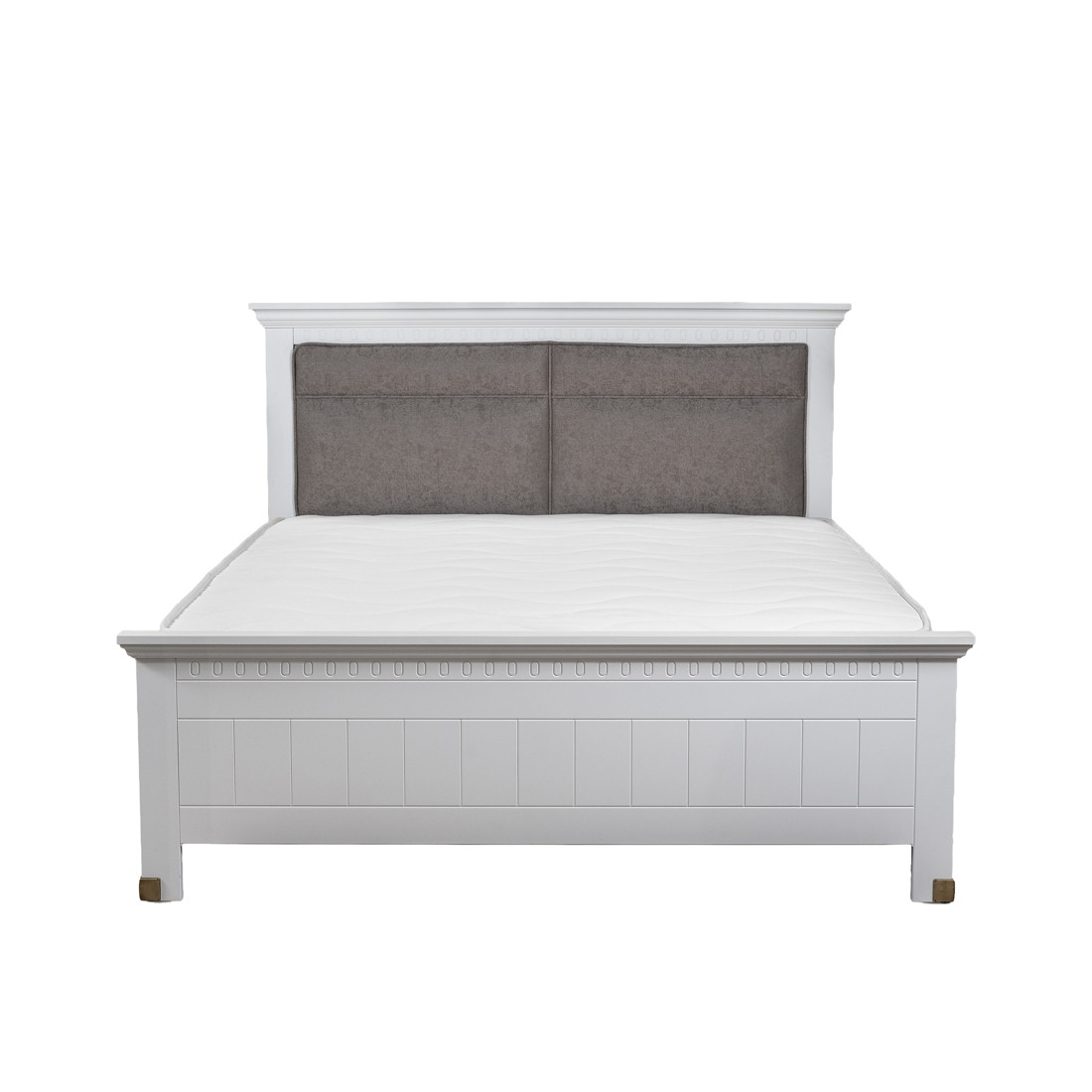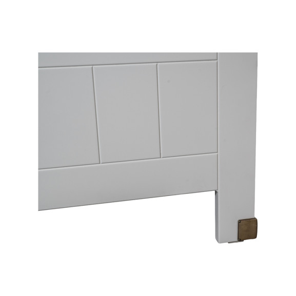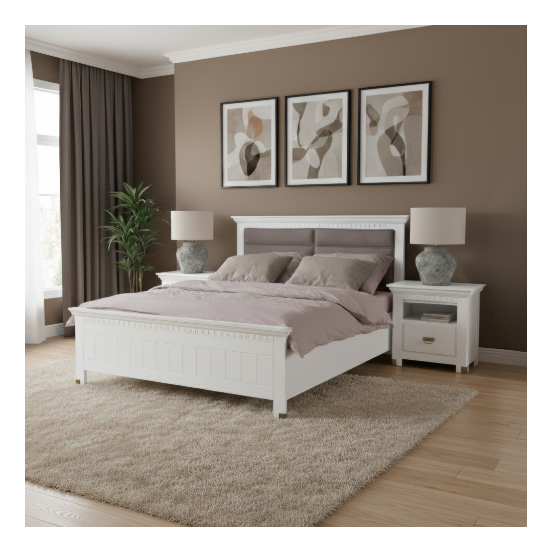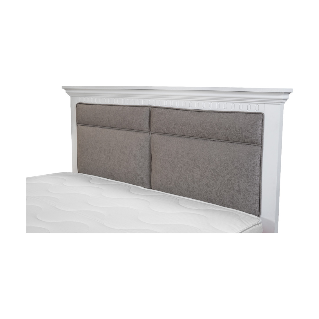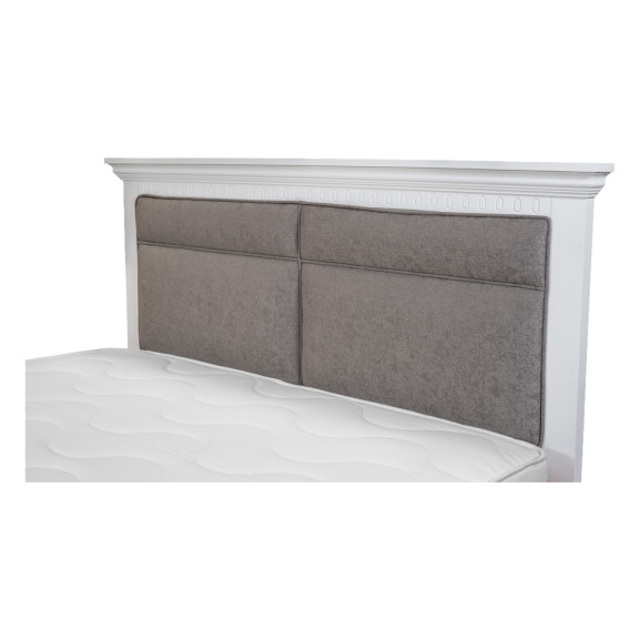Partea de la cap animă stilistic acest pat de dormitor, atât prin textura delicată a umpluturii și a stofei care o acoperă, cât și prin cromatica ce aduce o pată de culoare, în rest, în totalitate cuprins de un alb într-o nuanță liniștitoare.