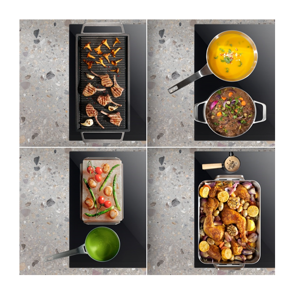 Functia FlexiBridge de la plita noastra cu inductie face gatitul mai confortabil. Cele trei optiuni de configurare asigura mai multa flexibilitate atunci cand folosesti in acelasi timp oale si cratite de diferite forme. Alege doua zone de dimensiuni medii; una mica si una mare; sau una singura, foarte mare pentru grill-ul plancha.