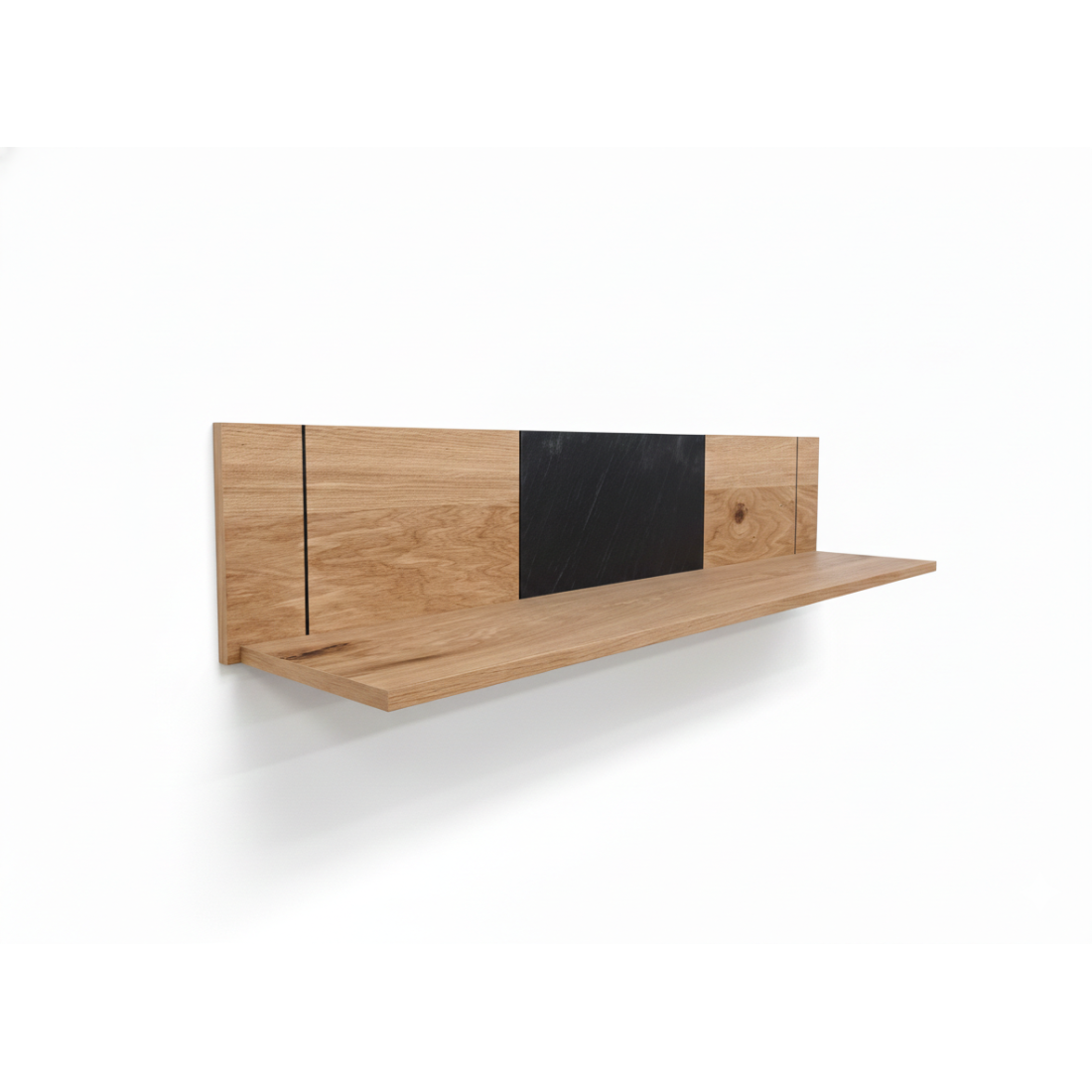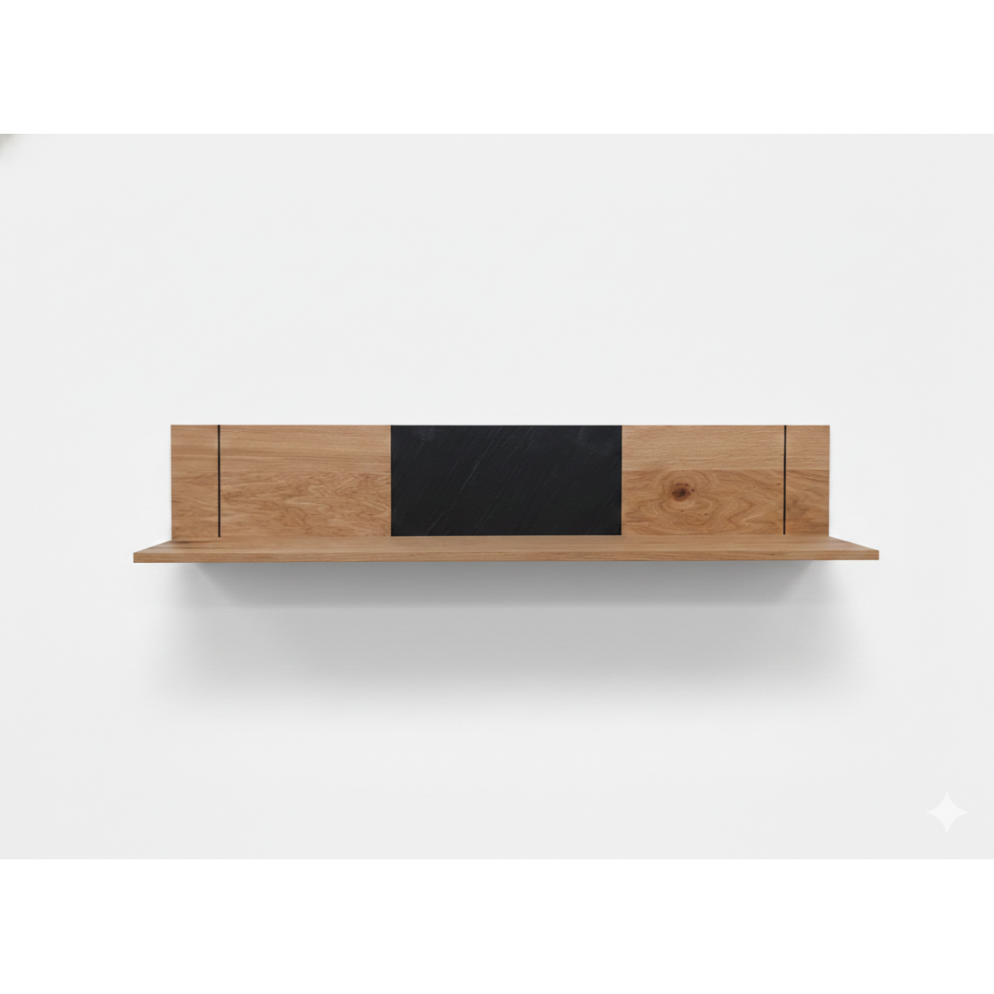 Elementul definitoriu este panoul din spate, care combină căldura furnirului natural de stejar (pe laterale) cu un panou central spectaculos, având un finisaj tip "Stone" (aspect de granit/piatră). Liniile verticale negre separă cele două texturi, oferind un look modern și industrial. Cu o lățime de 145 cm, este dimensionată perfect pentru a fi montată deasupra comodei TV sau a bufetului Zenith, oferind locul ideal pentru cărți, fotografii sau plante curgătoare.