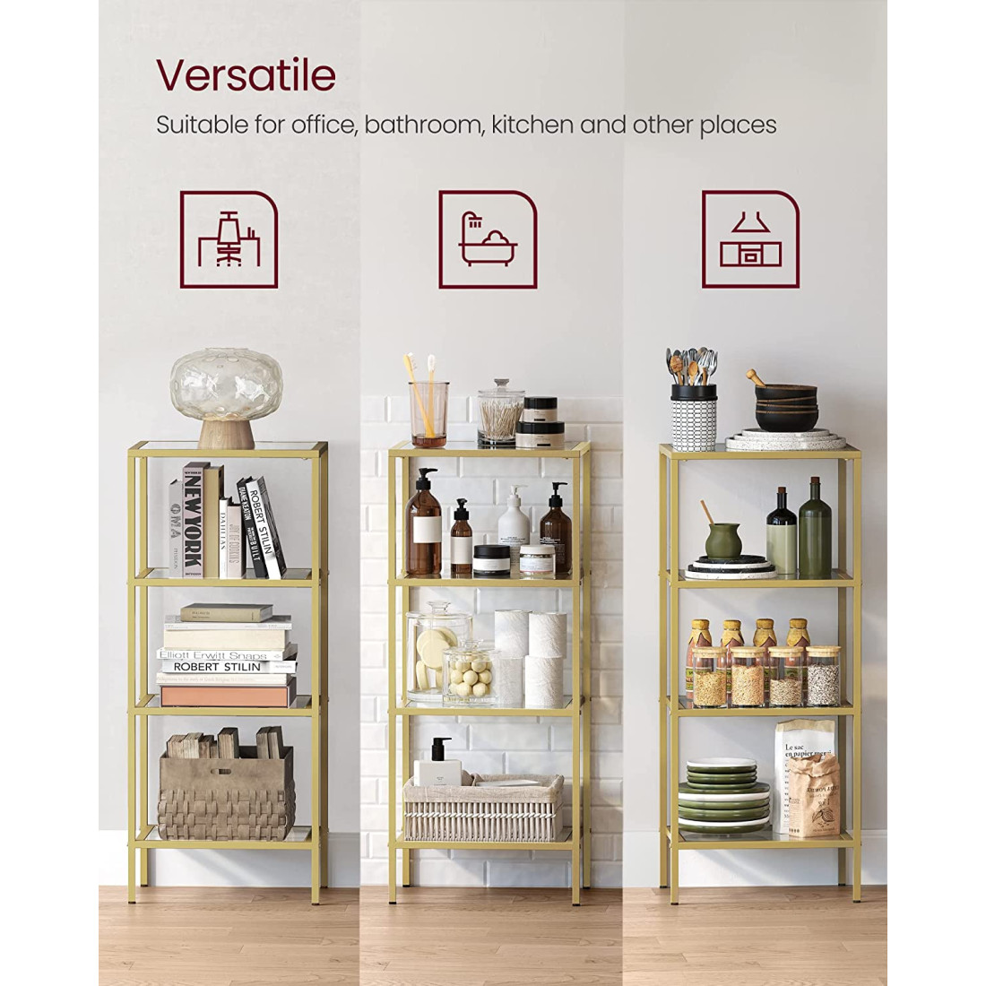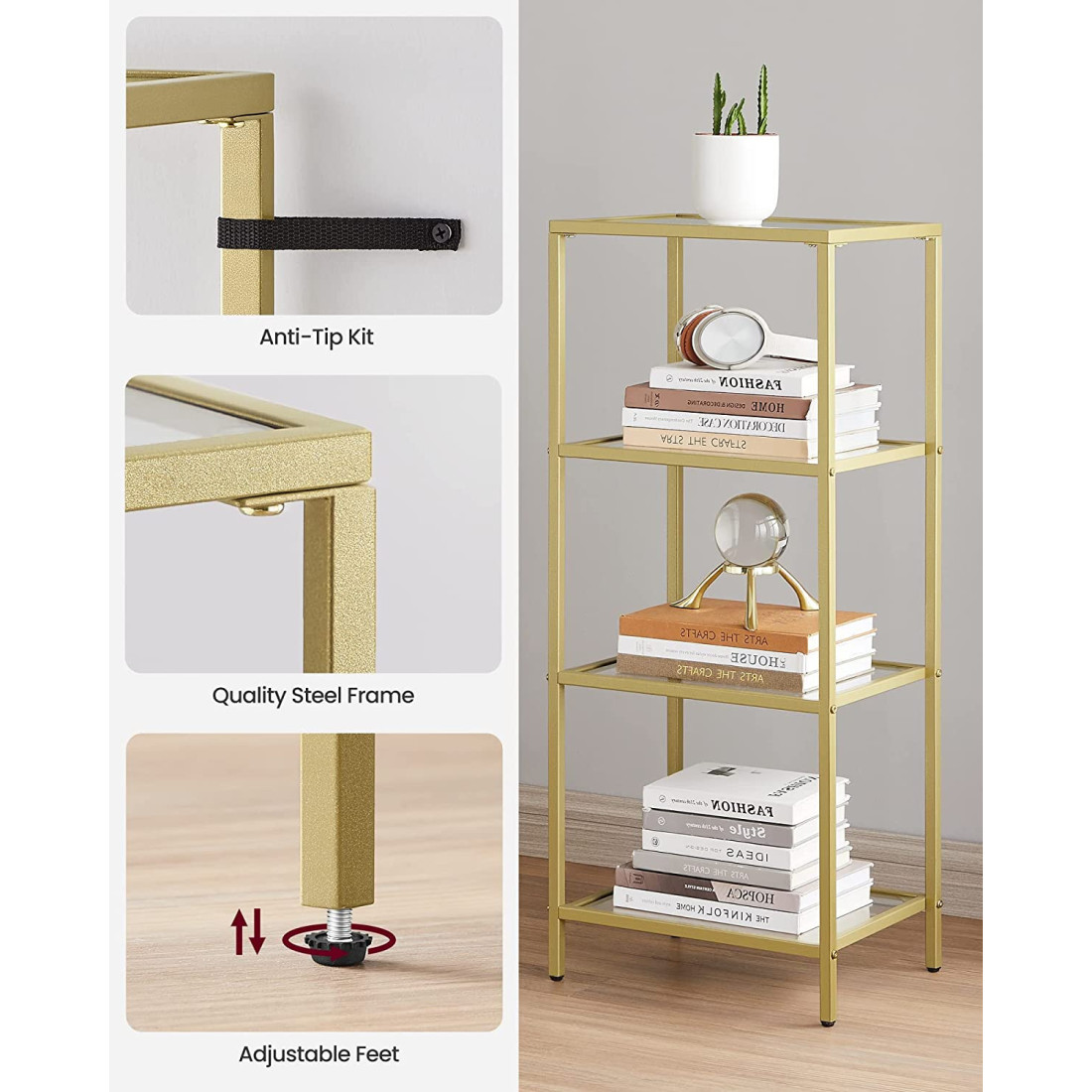 Cu rafturi din sticlă transparentă și un cadru de culoare aurie, acest suport de depozitare cu 4 niveluri se mândrește cu un minimalism modern uimitor. Vă permite să vă expuneți verdeața, cărțile și obiectele de colecție, ridicând în același timp aspectul spațiului dumneavoastra.