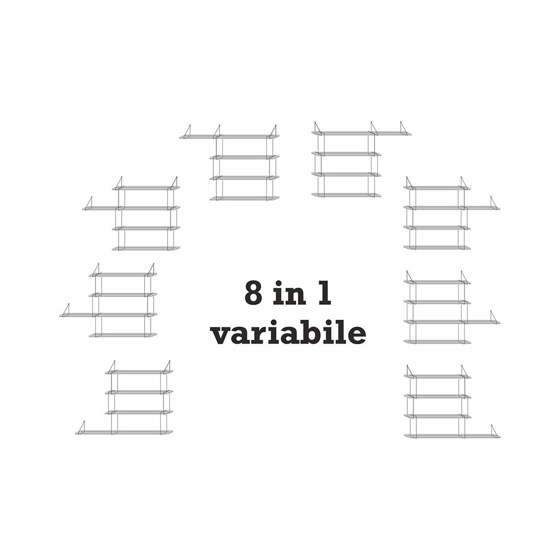 Etajera poate fi asamblata in 8 moduri diferite in fuctie de dorinta si necesitate.