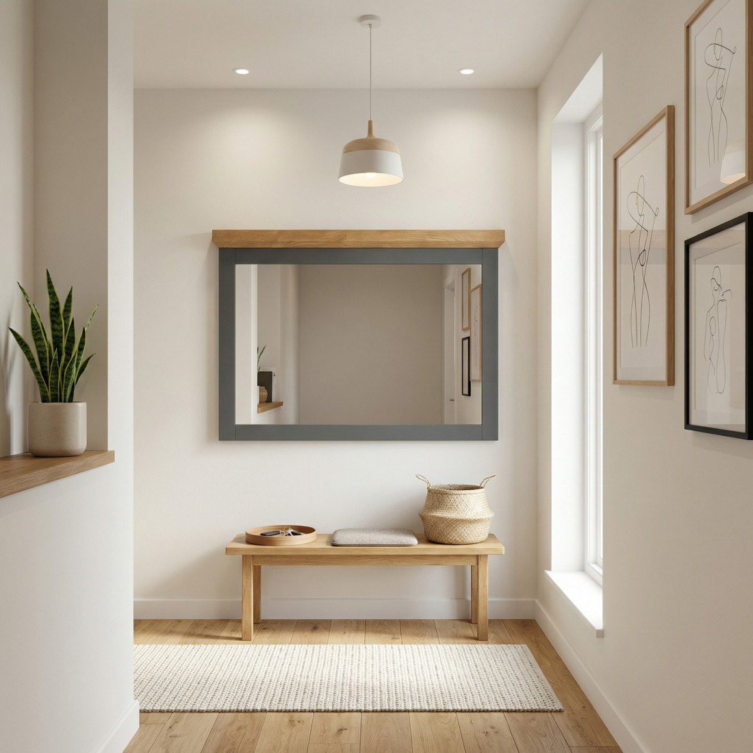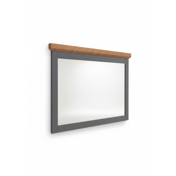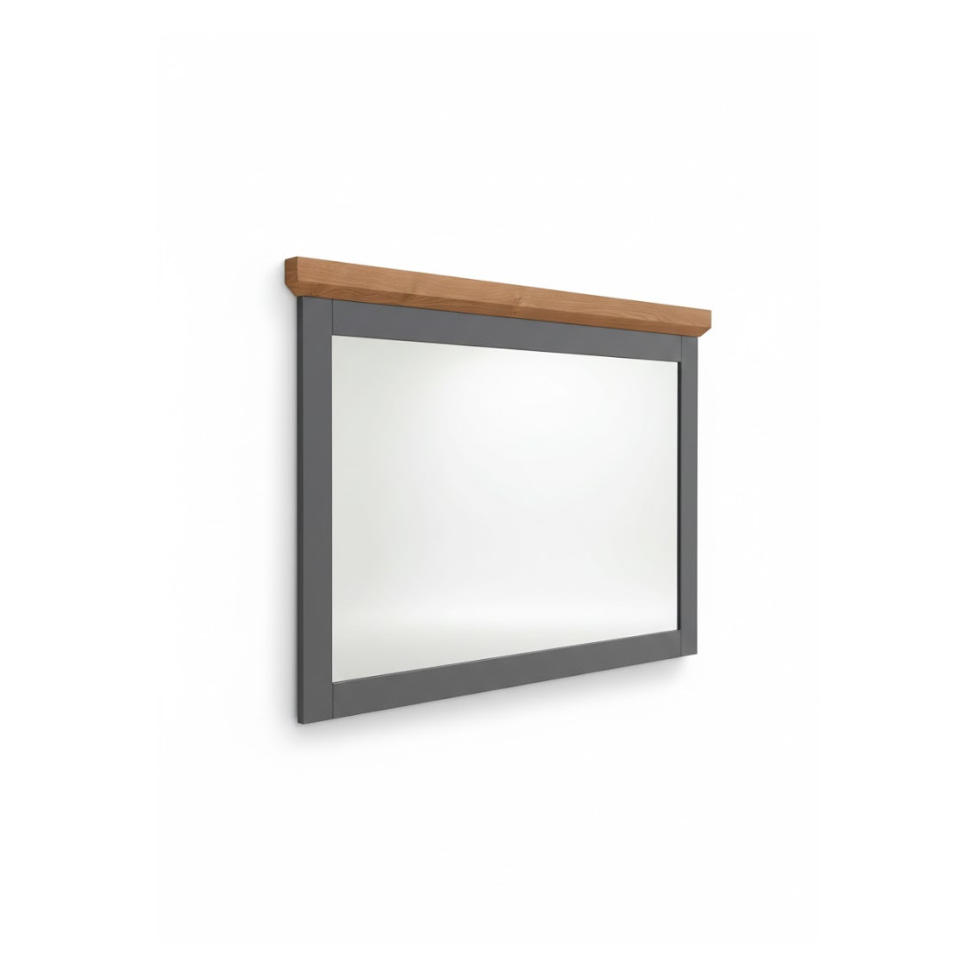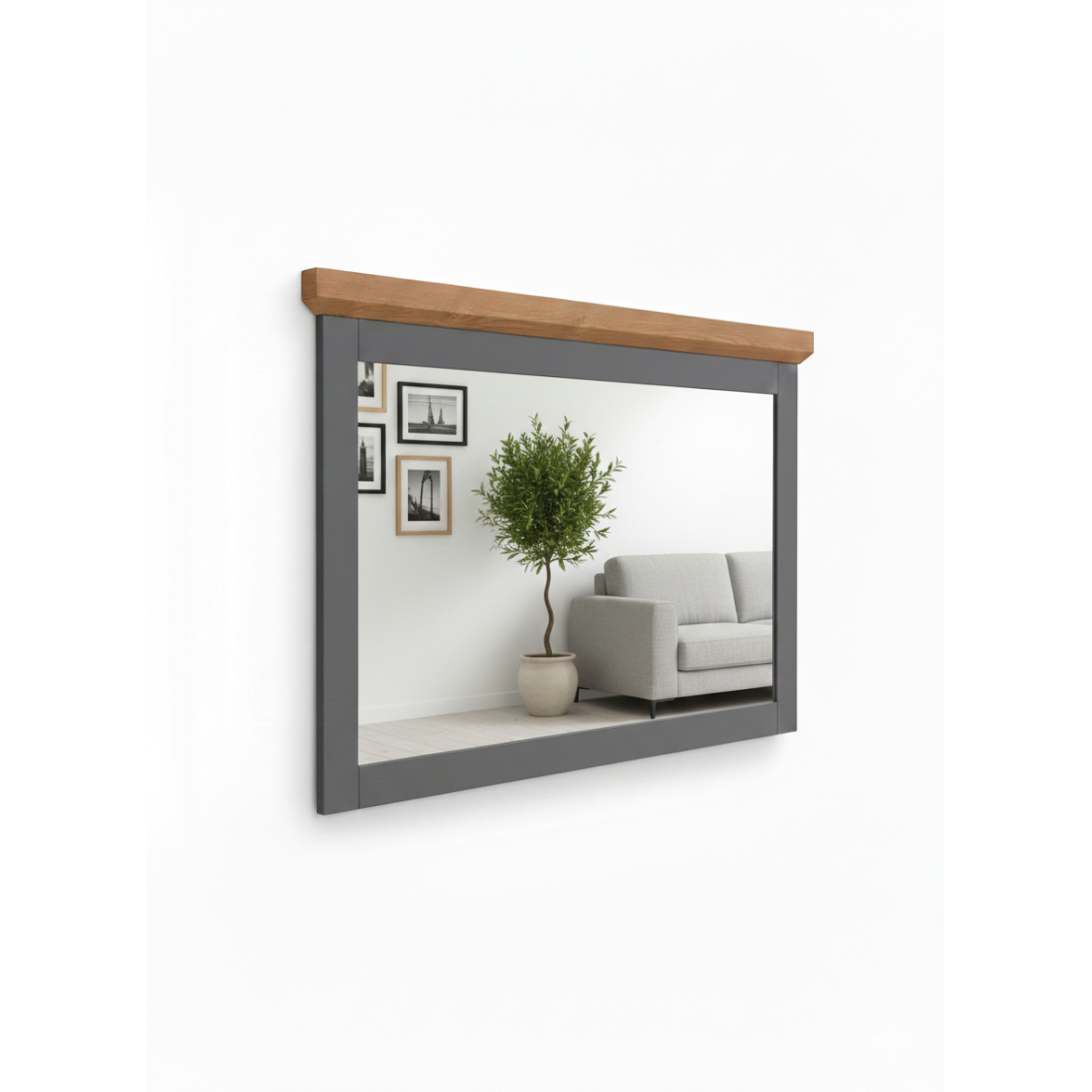 Rama solidă, finisată în gri vopsit, oferă un contur curat și elegant, în timp ce cornișa superioară din furnir natural de stejar adaugă acel detaliu de noblețe care leagă vizual oglinda de restul mobilierului din colecție.