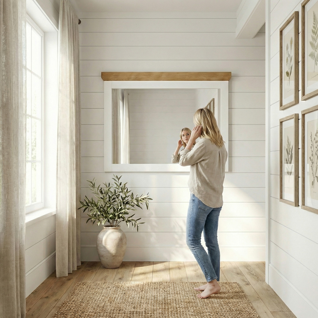 Rama solidă, finisată în alb vopsit, oferă un contur curat și elegant, în timp ce cornișa superioară din furnir natural de stejar adaugă acel detaliu de noblețe care leagă vizual oglinda de restul mobilierului din colecție.