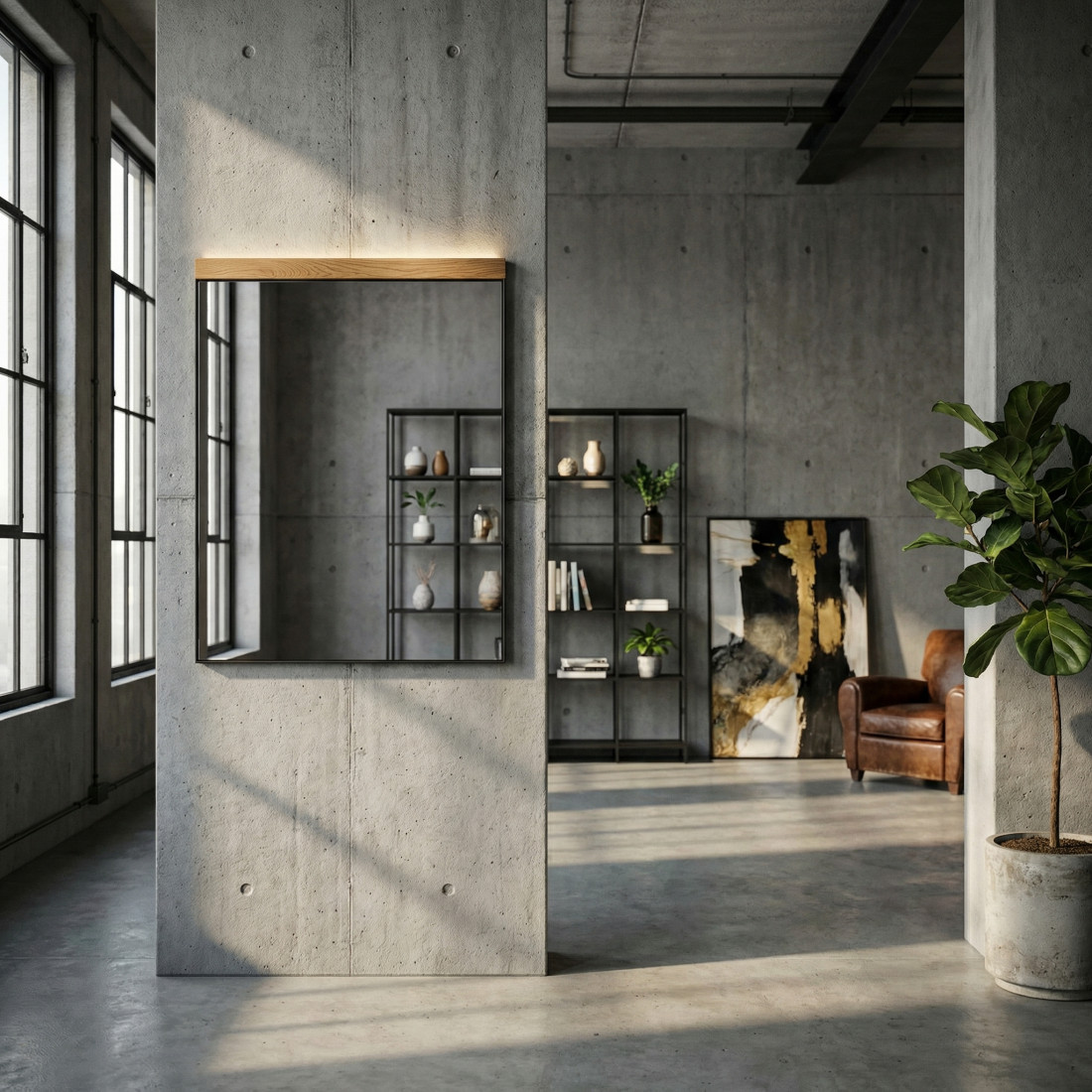 Completează amenajarea holului cu Oglinda Zenith, un accesoriu care îmbină funcționalitatea cu estetica industrial-modernă. Această piesă este proiectată pentru a adăuga profunzime spațiului, fiind montată pe un panou suport negru, care îi conferă un contur subtil și elegant.