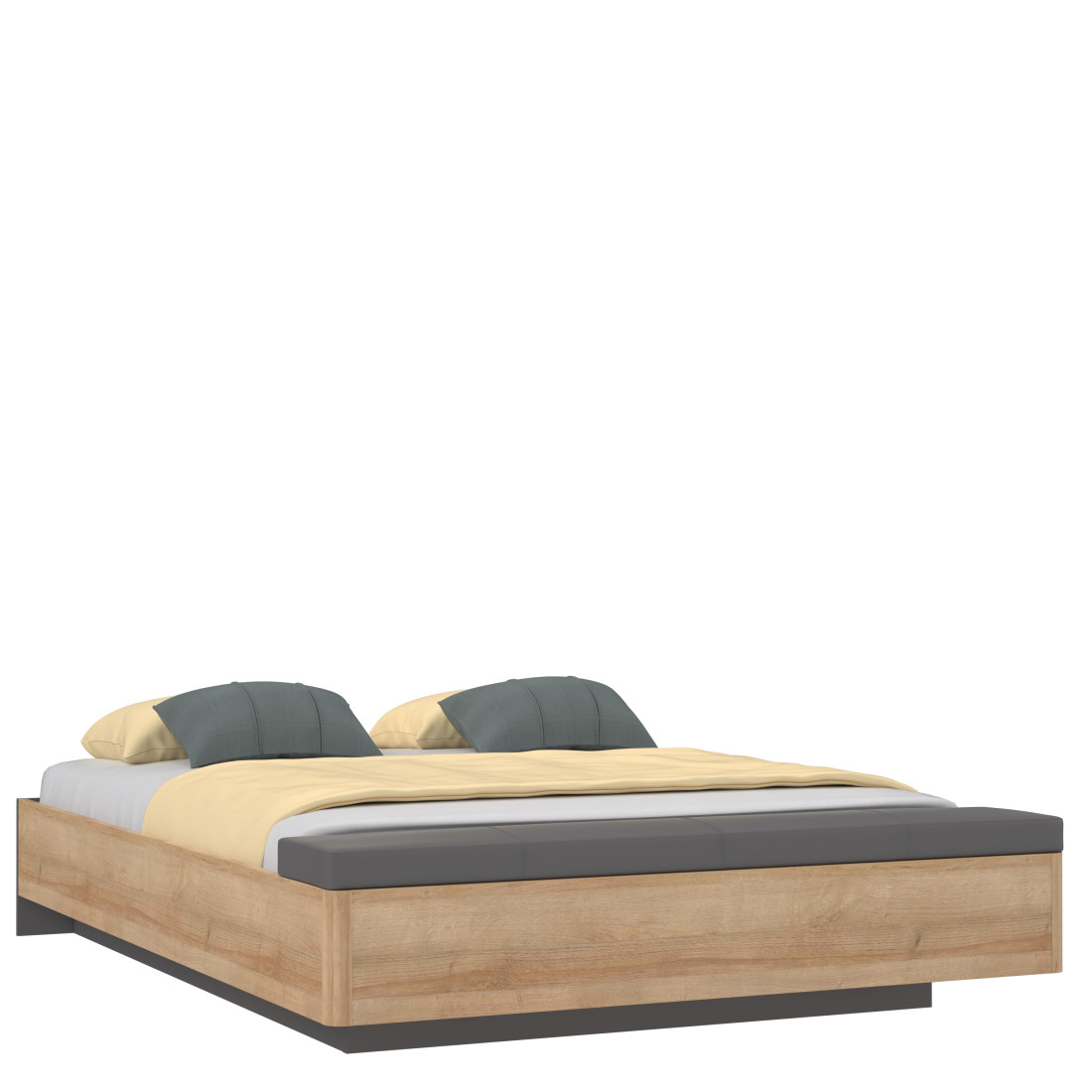 Rama de pat se distinge prin finisajul natural de Riviera Oak, completat de accentele moderne Uni Wolfram Grey. Elementul surpriză este bancheta tapițată integrată la baza patului, care nu doar că oferă un loc confortabil pentru relaxare, dar servește și ca element vizual distinctiv. Construcția solidă "plutitoare" adaugă o notă de lejeritate vizuală camerei, facilitând în același timp curățenia.