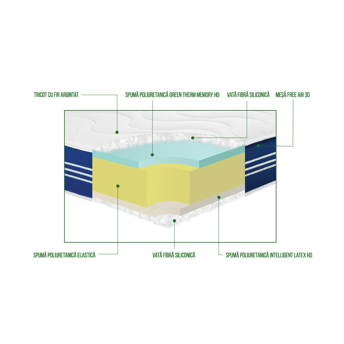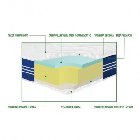 Funcția anatomică are rolul de a vă relaxa complet mușchii pentru o circulație sangvină sănătoasă. Al treilea rol pe care această saltea îl îndeplinește este cel ergonomic, rol menit să vă asigure un confort sporit în timpul somnului. Structura saltelei SILVER ACTIVE 3 cm poliuretan Green Therm Memory HD 14 cm poliuretan elastic 3 cm poliuretan Intelligent Latex HD Înălțimea saltelei: 23 cm (+/-1 cm) Recomandări de utilizare: Salteaua trebuie utilizată pe o ramă de lemn, a cărei parte inferioară să permită aerisirea saltelei (să existe spațiu între scândurile care compun partea inferioară a ramei).Sau pe o somieră tapițată cu structură de arcuri aerisită.