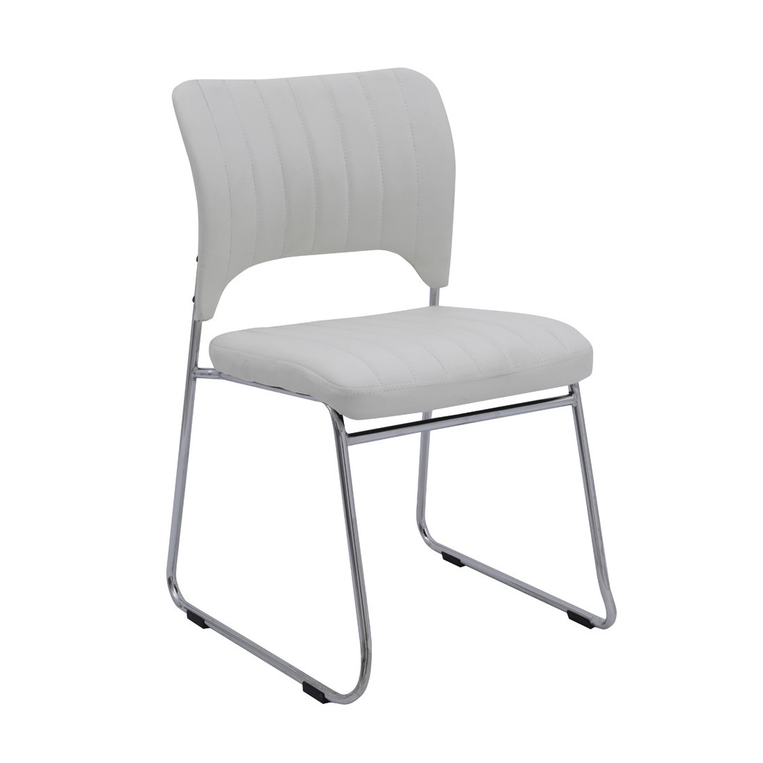 Scaun de bucatarie de culoare crem. Scaunul are un format ergonomic si un design clasic. Cusaturile de pe spatar dar si cele de pe sezut ii confera rezistenta tapiteriei si o senzatie de confort, astfel nedeformandu-se datorita utilizarii intense. Tapiteria este din piele ecologica cu cusaturi la culoarea pielii. Cadrul este din metal vopsit si prezinta dopuri de plastic la contactul cu pardoseala, protejand parchetul sau gresia. Cadrul este sudat, sarcina de testare este de 130 kg. Produsul necesita montaj.